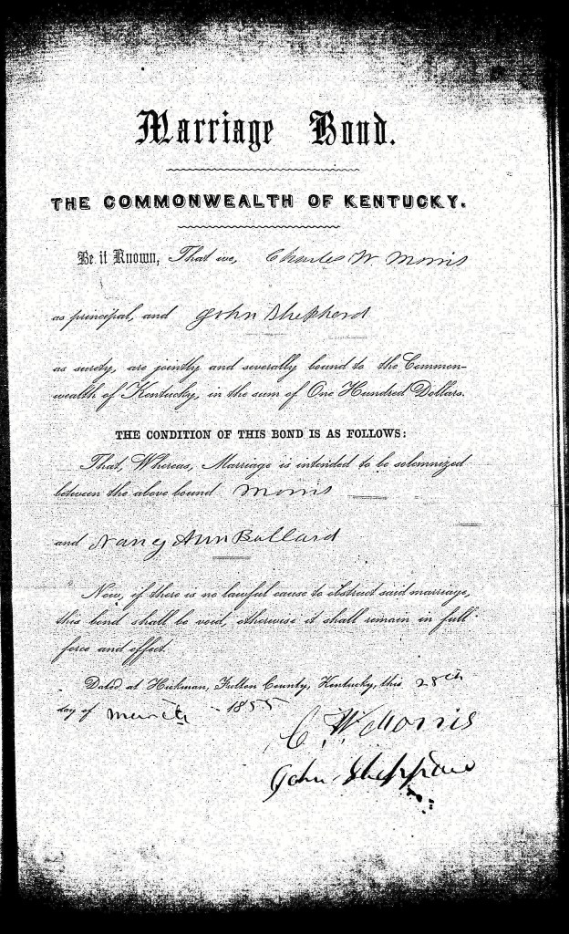 Charles W. Morris married Nancy Ann Ballard in Fulton County, Kentucky, on or shortly after 28 March 1855, the date on which he gave bond for the marriage.[14] Nancy appears to have died about 1858. Charles remarried to Nancy Jane Oakes in Hickman County, Kentucky, on 1 August 1866.