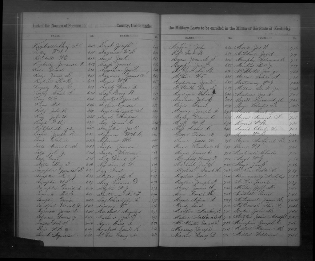 By Nancy Jane Oakes, Charles W. Morris appears to have had daughters Mary (born about 1867) and R. Morris (born about 1873), both born in Fulton County, Kentucky.[21]