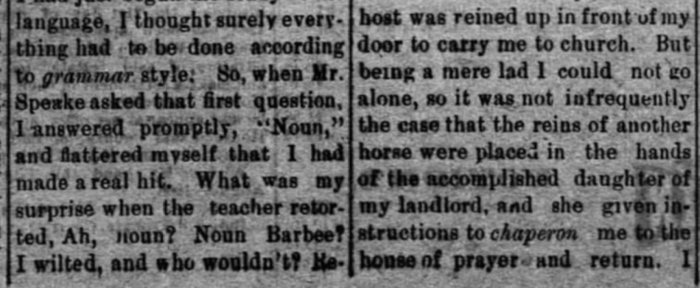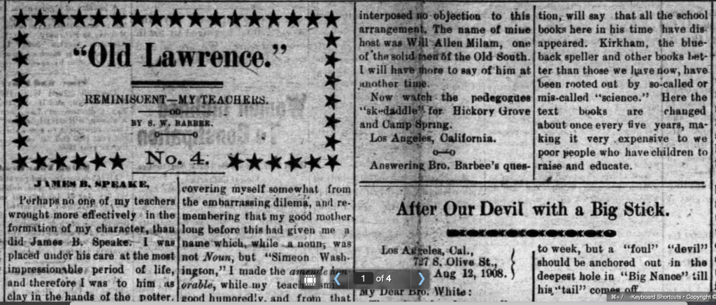 Several months before Barbee published his February 1909 reminiscence of James B. Speake, he had published another “Old Lawrence Reminiscent” column on 25 August 1908, in which he talks about the influence James B. Speake had on him as a teacher, an influence that resulted in Barbee’s becoming a teacher.[6]