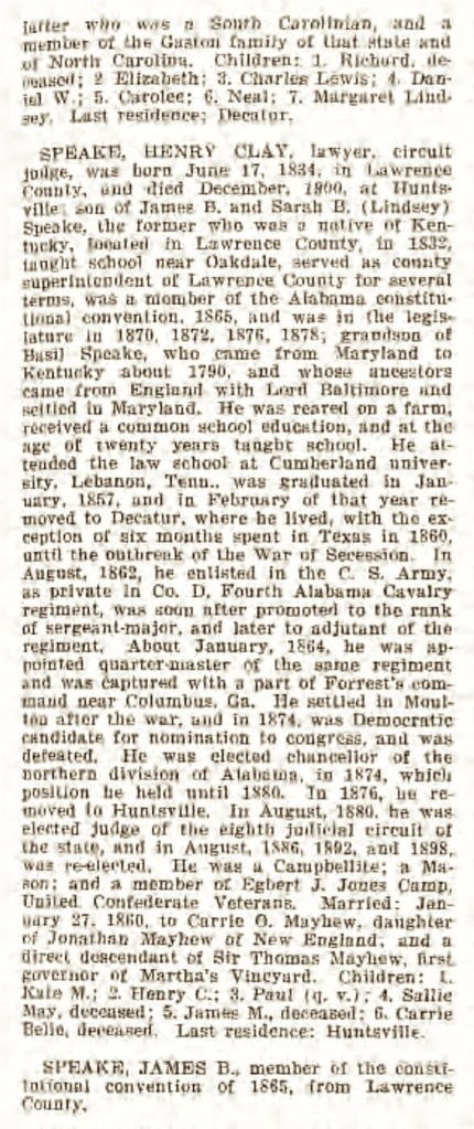 Another obituary of James B. Speake appeared in the Huntsville paper, Times Daily on 3 October 1890. I do not have a digital copy of this obituary. It is transcribed on his Find a Grave memorial page, which was created by David Young. James’s son Henry Clay Speake had moved to Huntsville in 1876, where he was elected judge of the 8th judicial circuit in 1880, a position he held continuously up to his death. He had previously served as Chancellor of the Northern Division from 1874 to 1880.