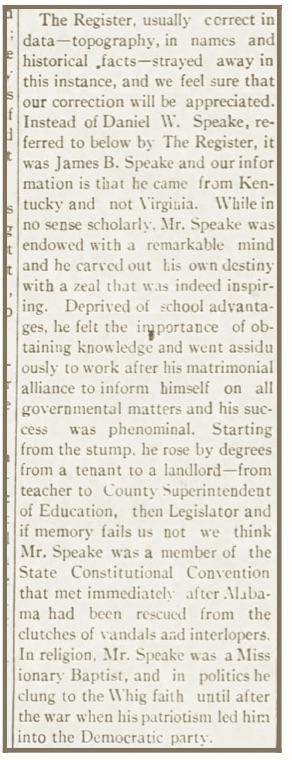 On 7 October 1914 in a column entitled “Beginning the Day, Jourd White’s County,” the Moulton Advertiser paper published the following information about James B. Speake, in response to a recent statement about Speake that had appeared in the Mobile Register. The Advertiser column contains the Register statement, noting that it had confused James B. Speake with his son Daniel Webster Speake, and that it also erroneously stated that he came to Alabama from Virginia and had been an army colonel in Virginia.[7]