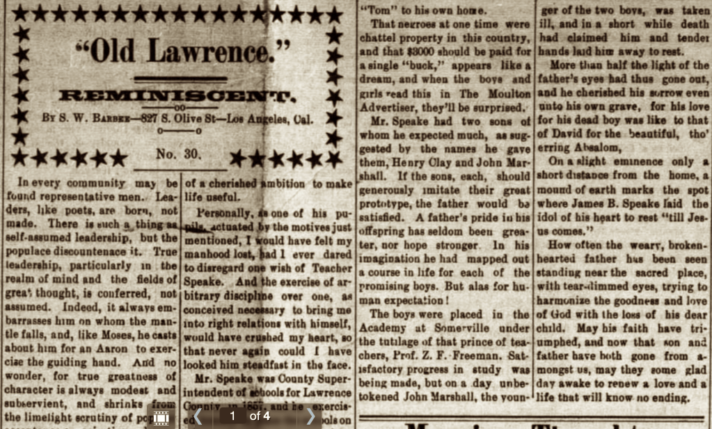 An article entitled “Old Lawrence Reminiscent” by S.W. (Simeon W.) Barbee in the Moulton Advertiser newspaper on 16 February 1909 contains a memorial of and tribute to Speake by Barbee, who had been his pupil at Oakville.[5]