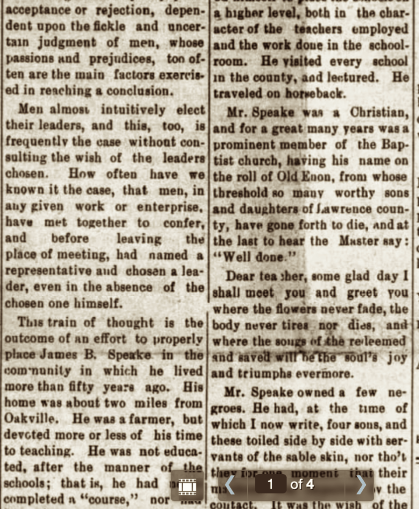 John Knox’s History of Morgan County, Alabama also has biographical information about James B. Speake, noting that he was born in 1803 and died in 1890, being buried with his wife Sarah “near Speake school.”[10] Knox notes that James was born and educated in KY, and taught at Oakville, where he owned a plantation. He also observes that he was superintendent of education for Lawrence County several times, a member of the constitutional convention of 1865, and active in his Enon Baptist church and Masonic lodge.