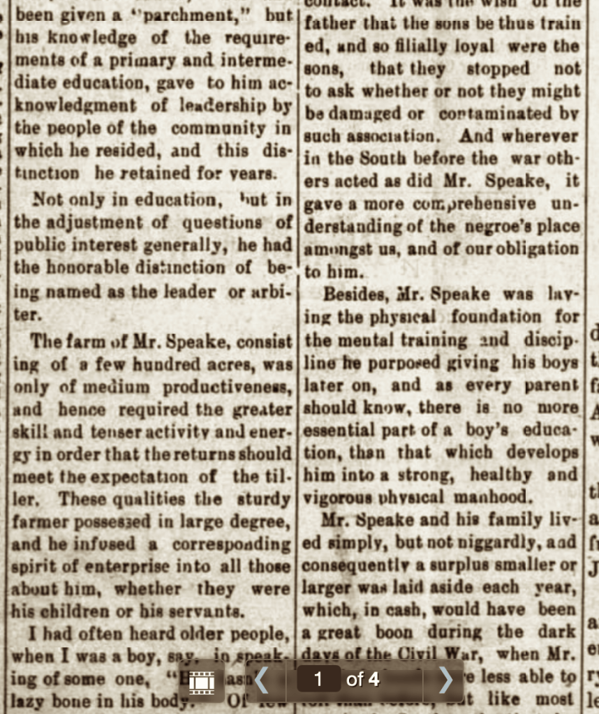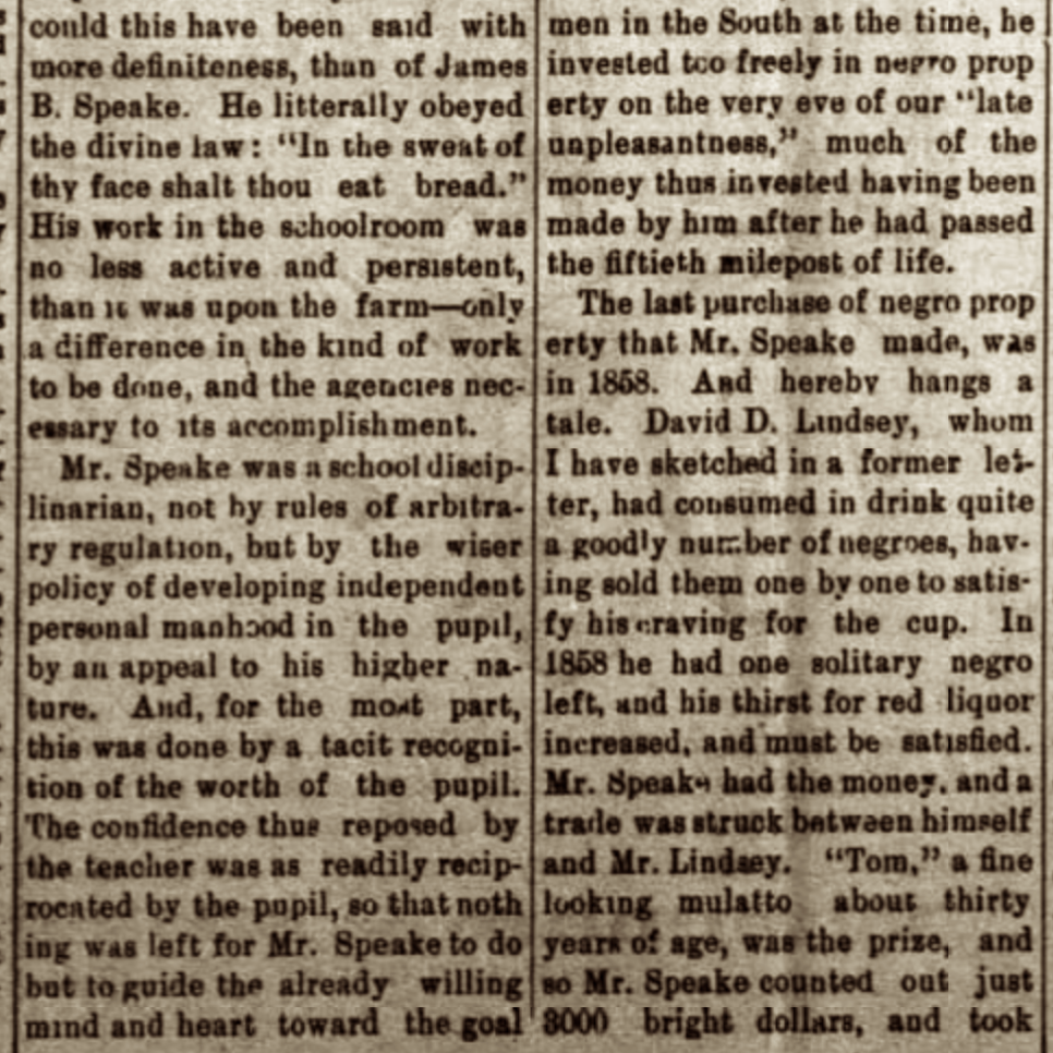 In his 1899 book Early Settlers of Alabama, James Edmond Saunders, who knew James B. Speake personally, includes the following biographical notice of James B. Speake, whose surname Saunders spells as Speak; this notice is included in Saunders’s remarks about James’s father-in-law Dennis Lindsey and Dennis’s father Mark Lindsey:
