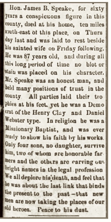 An obituary of James B. Speake is in the 25 September 1890 issue of the Moulton Advertiser.[8]