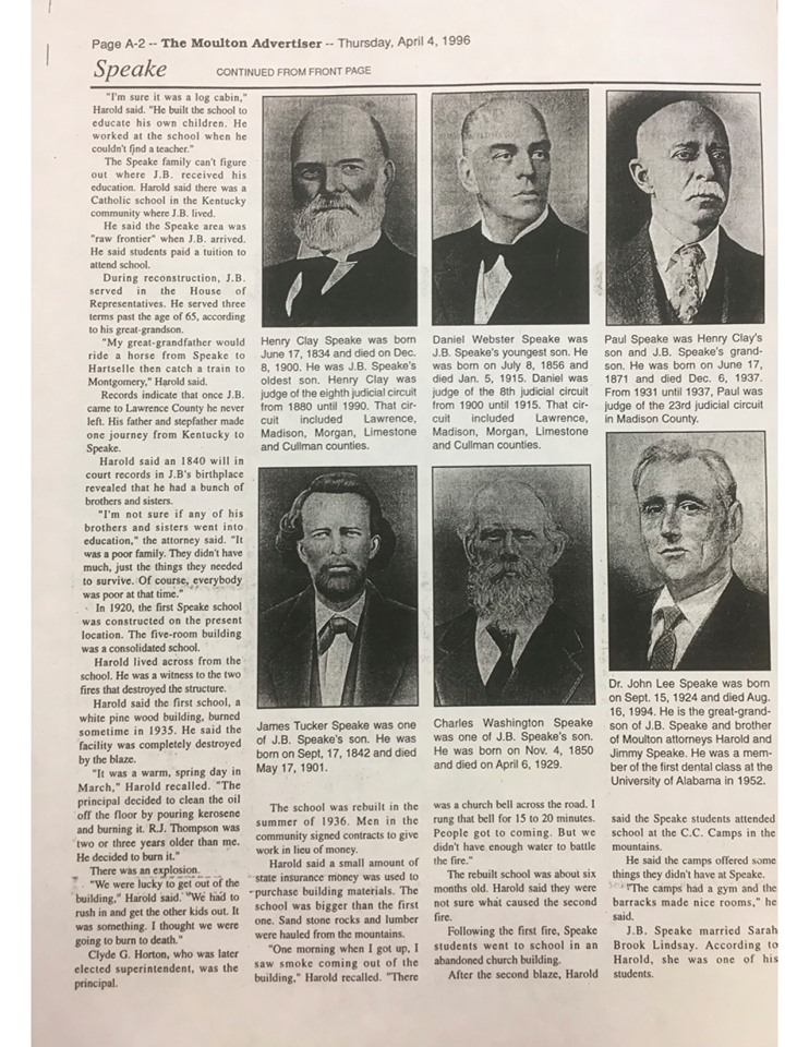 On 4 April 1996 article in the Moulton Advertiser newspaper, Deangelo McDaniel published an interview with James B. Speake’s great-grandson Harold Speake, who was then an attorney in Moulton.[9] This article also includes photos of four of James B. Speake’s sons — Henry Clay, Daniel Webster, James Tucker, and Charles Washington Speake — as well as of James’s grandson Paul Speake and great-grandson John Lee Speake, Harold’s brother. I visited Harold Speake at his law office in Moulton in the 1980s, and at that time, these photos lined the hallway of his office.