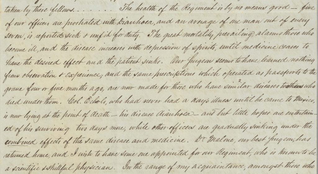 The health of the Regiment is by no means good — five of our officers are prostrated with Diarrhoea, and an average of one man out of every seven, is reported sick & unfit for duty. The great mortality prevailing, alarms those who become ill, and the disease increases with depression of spirits, until medicine ceases to have the desired effect and the patient sinks. Our Surgeon seems to have learned nothing from observation & experience; and the same prescriptions which operated as passports to the grave four or five months ago, are now made for those who have similar diseases to others who died under them. Col. Echols, who had never had a day’s illness until he came to Mexico, is now lying at the point of death — his disease diarrhoea — and but little hopes are entertained of his surviving two days more, while other officers are gradually sinking under the combined effects of the same disease and medicine. Dr. Malone, our best Surgeon, has returned home, and I wish to have some one appointed for our Regiment, who is known to be a scientific & skillful physician.