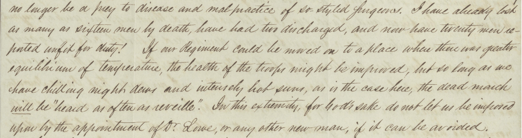 I have already lost as many as sixteen men by death, have had two discharged, and now have twenty reported unfit for duty! If our Regiment could be moved on to a place where there was greater equilibrium of temperature, the health of the troops might be improved, but so long as we have chilling nights dews and intensely hot suns, as is the case here, the dead march will be “heard as often as reveille.”