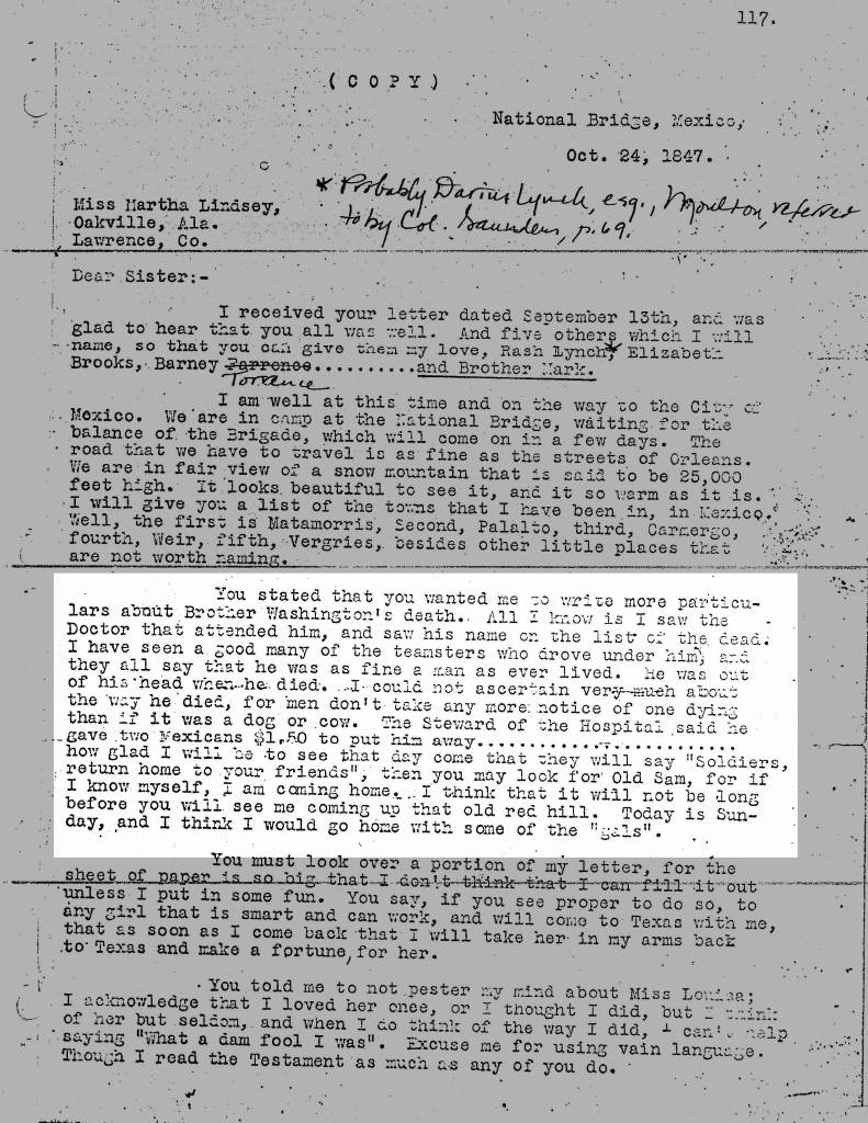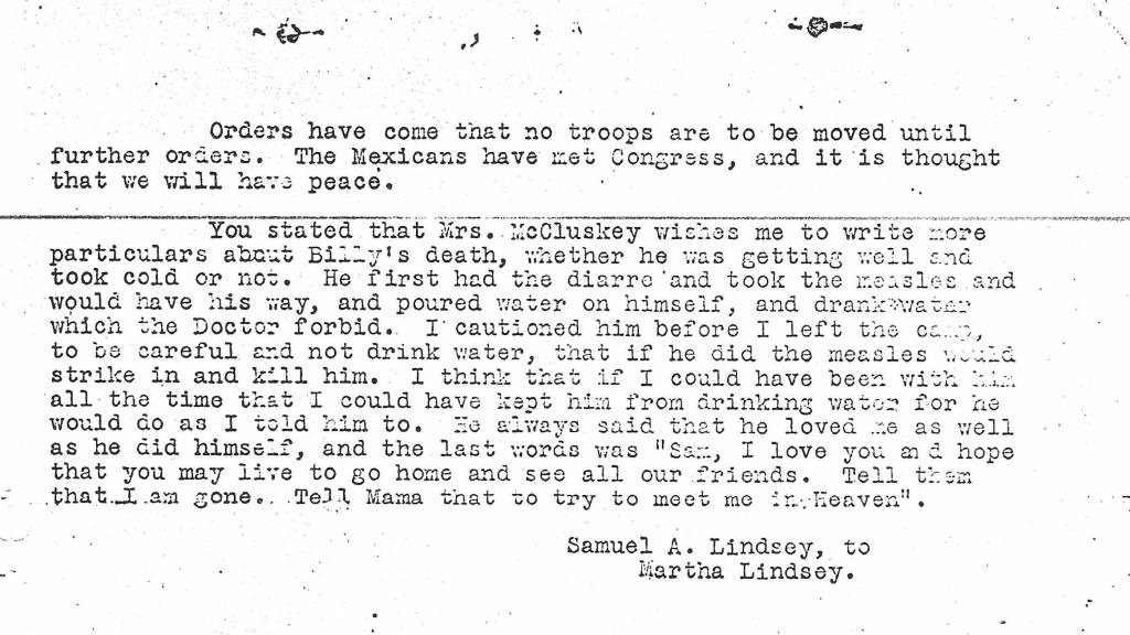 Though I have located Mexican-American War service papers for Samuel A. Lindsey, I have been unable to find such papers for either Charles Washington Lindsey or William McCluskey. It’s clear from what Samuel’s letter says, however, that both were in service in Mexico when they died, and that Samuel was with Billy McCluskey when the young man died. It should be noted that Charles was apparently serving as a teamster, and teamsters had separate contracts during this war: they were hired workers on behalf of the military rather than enlisted soldiers.