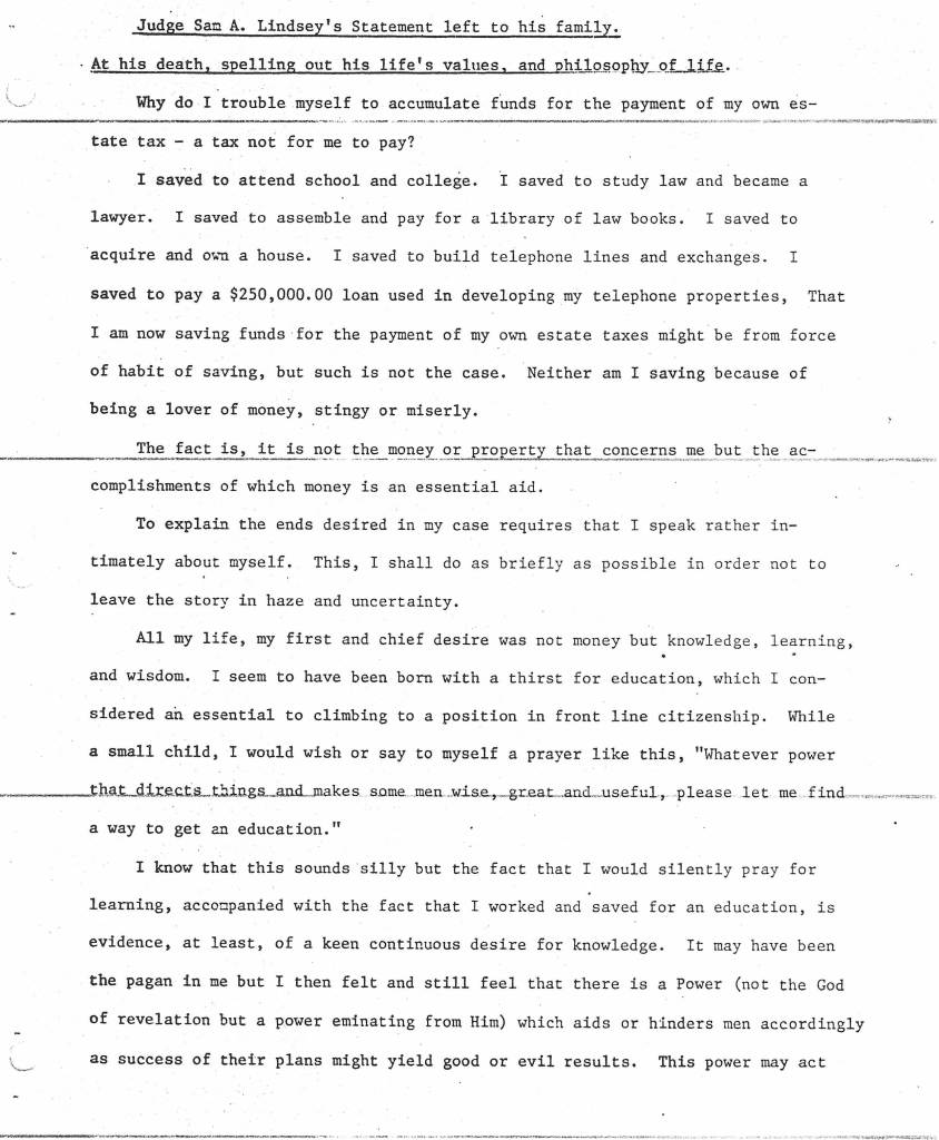 Mark Lindsey Heritage reproduces the preceding typewritten autobiographical statement written by Samuel A. Lindsey at an unknown date,[31] which he apparently left to his family as a statement of his philosophy of life.
