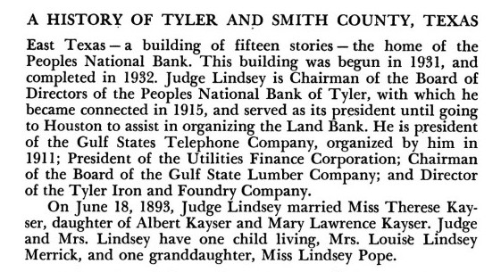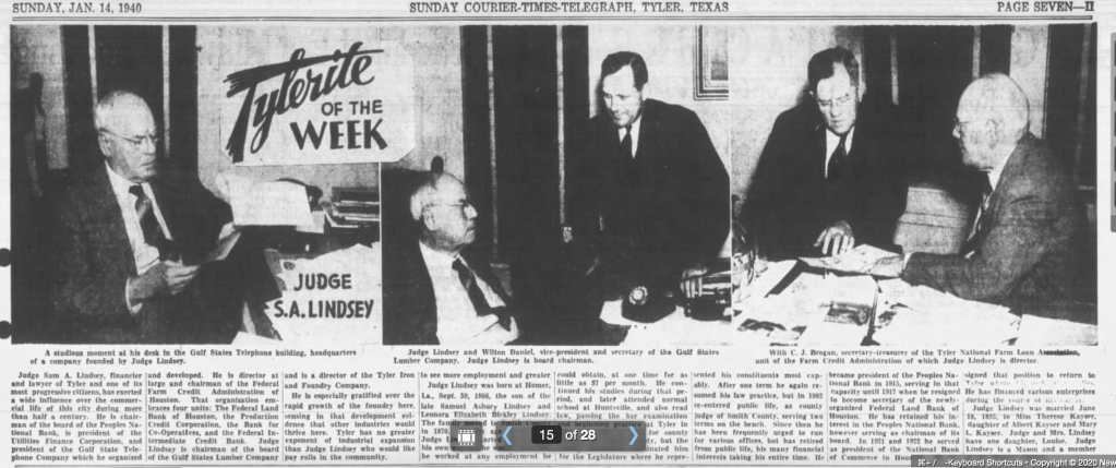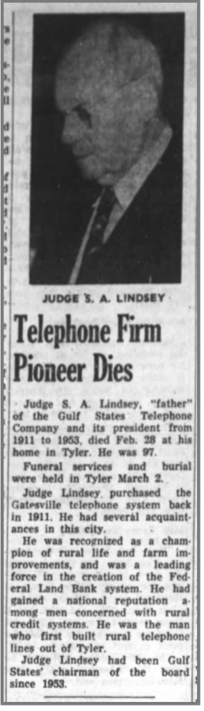 The biographical sources also note that in 1901, Samuel A. Lindsey was elected county judge of Smith County, serving four years. In the same year, he founded the S.A. Lindsey Telephone System, which had become the Southern Telephone and Telegraph Company with 1905 and then in 1911, with continued growth under Samuel A. Lindsey’s leadership, the Gulf States Company in 1911.