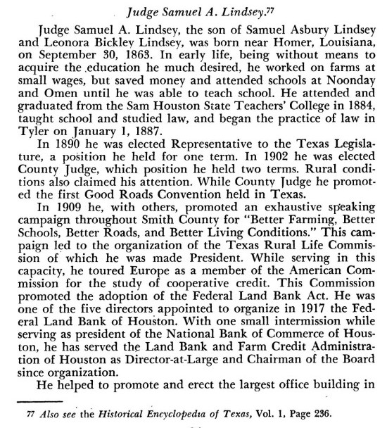 Albert Woldert’s A History of Tyler and Smith County, Texas, also contains the following biography[24] of Samuel Asbury Lindsey: