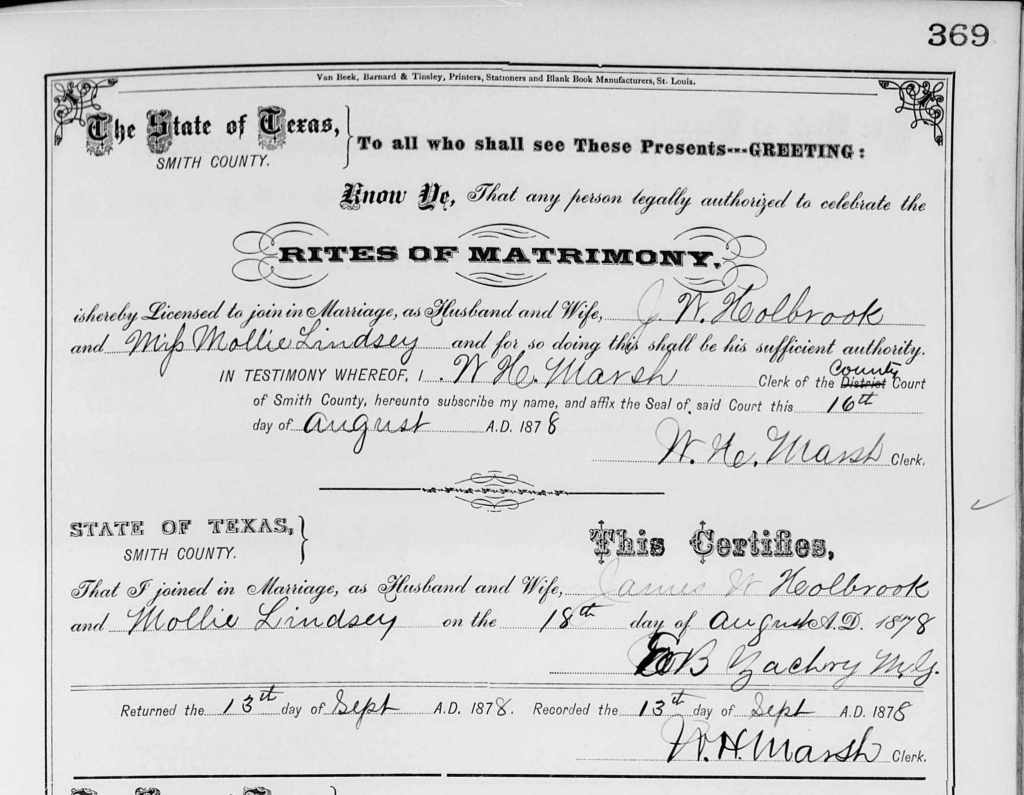 [19] Smith County, Texas, Marriage Bk. H, p. 369.