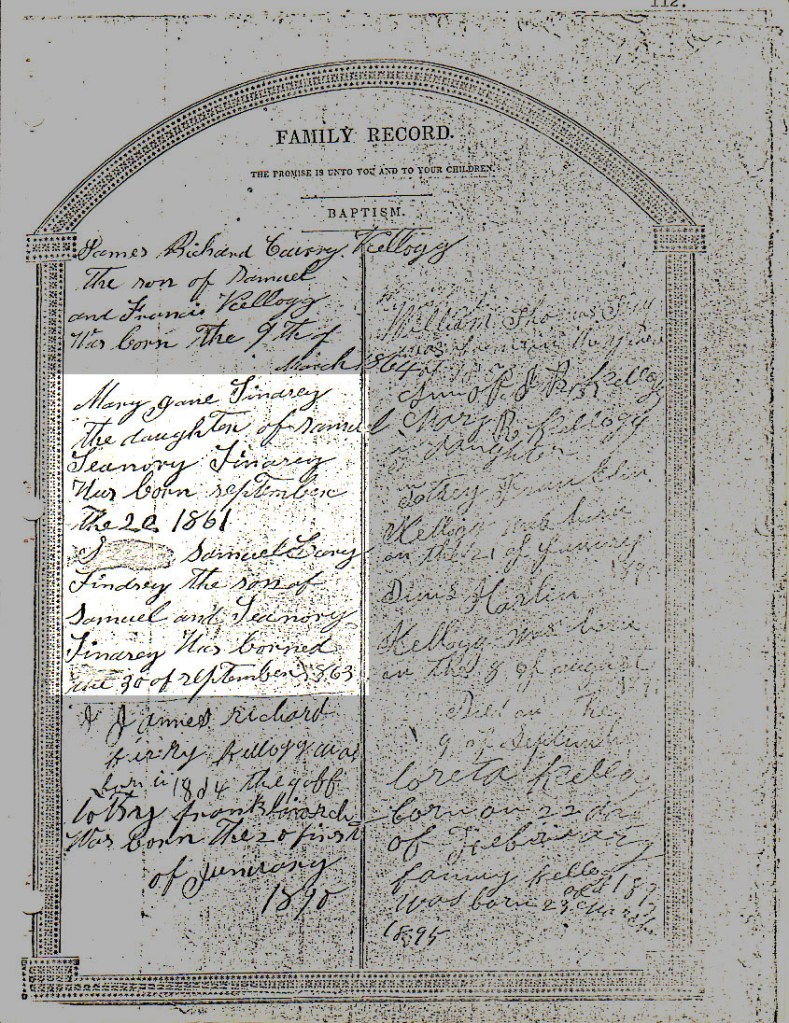 As noted previously, the bible of Samuel Asbury Lindsey’s sister Frances Rebecca Kellogg records the dates of birth of his two children by Lenora Elizabeth Bickley, with this document giving Samuel’s middle name as Cary, though all other sources show him as Samuel Asbury Lindsey (Jr.), and this is the name he used throughout his life. The children of Samuel Asbury Lindsey and Lenora Elizabeth Bickley are as follows: