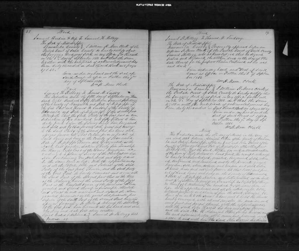 On 5 September 1850, the day before the preceding deed was filed, Samuel H. Kellogg sold his brother-in-law Thomas M. Lindsey, both of Itawamba County, another 160-acre tract in Itawamba — the northeast ¼ of section 35, township 10, range 8 east.[12] Thomas paid $250 for this land, and Samuel signed the deed with no witnesses and proved it the following day, when it was filed. The deed was recorded on the 7th of September.