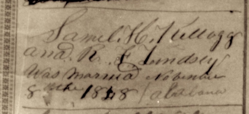 The bible register states, “Samel. H. Kellogg and R.F. Lindsey was married November 8th 1848 / alabama.” The handwriting for this entry in the bible register seems to me to be the same as the hand that recorded the dates of birth of Samuel and Frances Rebecca — a hand that I believe is Samuel’s. The Confederate widows’ pension application Frances Rebecca filed on 14 January 1913 has the same date of marriage, adding that the couple married at Oakville, Alabama, with Rev. David Dancy as the officiating minister.[4]
