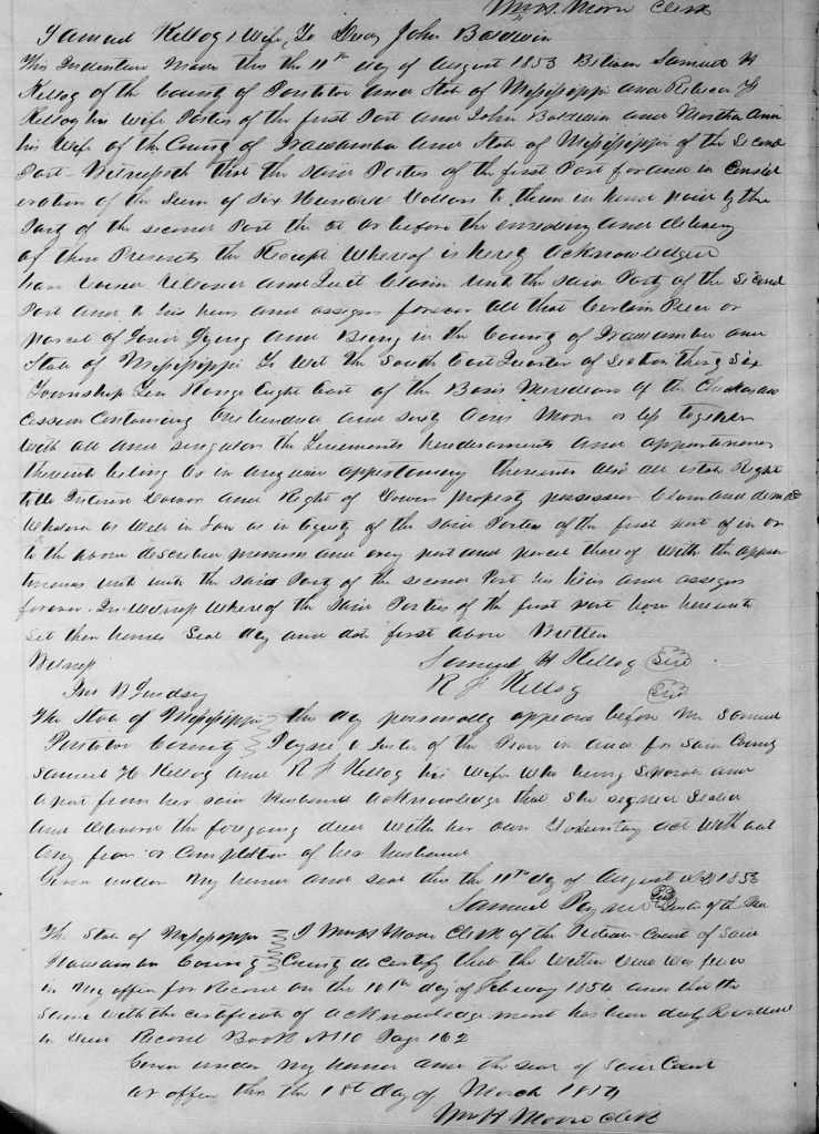 On 11 August 1853, Samuel H. Kellogg and wife Rebecca F. of Pontotoc County, Mississippi, sold to John Baldwin and wife Martha Ann of Itawamba County the 160-acre tract in Itawamba Samuel had bought from Samuel and Jane Burdine on 9 March 1850.[14] The land sold for $600. Both Samuel and Frances Rebecca signed the deed, she as R.F. Kellogg, with her brother John W. Lindsey witnessing. Samuel and Frances Rebecca proved the deed in Pontotoc County on the same day, and it was filed 10 February 1854 and recorded 1 March 1854. I find no indication in Pontotoc County land records that Samuel had acquired land there.