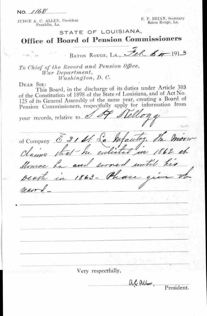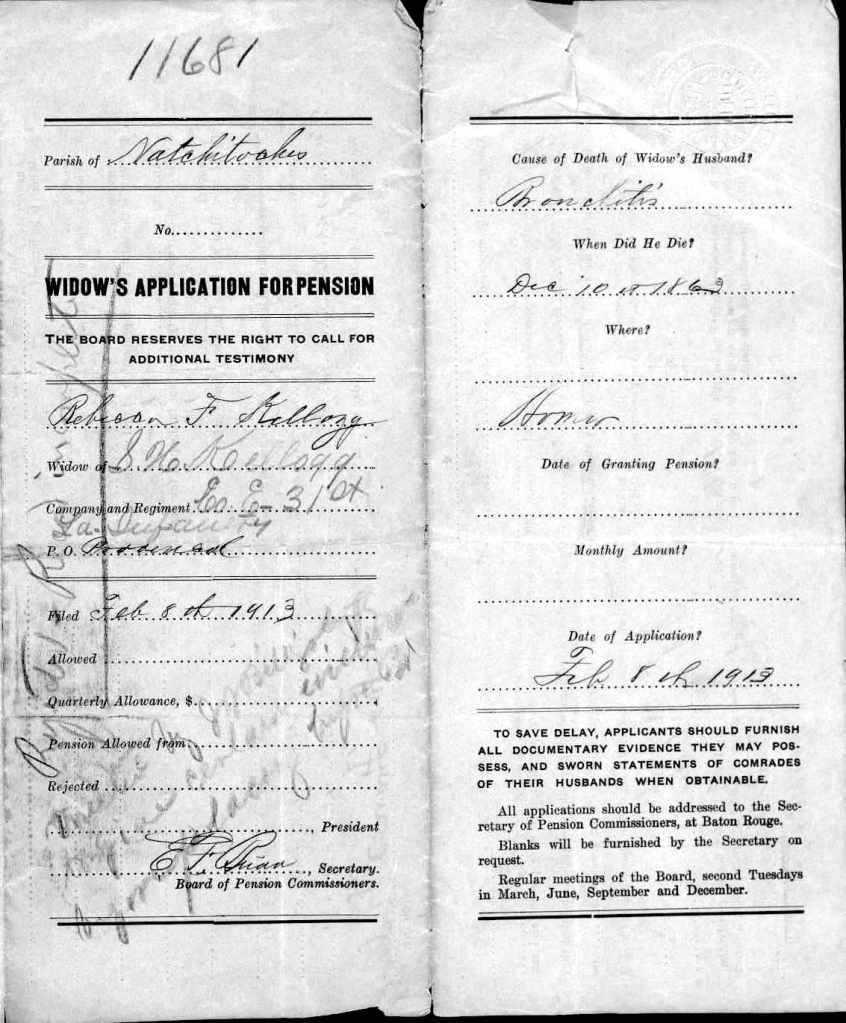 On 10 December 1863, Samuel Hiram Kellogg died of bronchitis at the family’s home in Homer, Claiborne Parish, Louisiana. As we saw in the previous posting, Frances Rebecca recorded her husband’s date of death in the family bible, stating that he was 35 years and 8 months old when he died. The same date of death appears in the affidavit Frances gave on 14 June 1913 at Provencal in Natchitoches Parish, where she was then living, as she filed a widows’ pension application for Samuel’s Confederate service. The application was submitted on 8 February 1913.