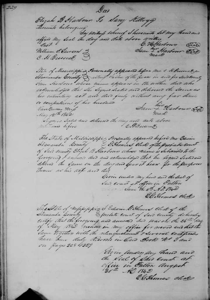 On 16 March 1842 Elijah B. Harbour and wife Jane sold to Sary Kellogg, all of Itawamba County, the northeast ¼ of section 35, township 10, range 8 east, 160 acres from the Chickasaw cession.[3] Sarah bought the land for $350. The deed states that it had appurtenances on it, which indicates that Sarah was buying not only a piece of land, but also probably a house and farm buildings — a homeplace on which she might already have been living. E.B. Harbour and his wife Jane signed the deed, Jane using a mark, and it was witnessed by William J. Lawson and C.H Bessonett. Jane relinquished her dower at Van Buren on 12 May 1842, Elijah acknowledged the deed at Fulton on 4 June 1842, and it was recorded on 26 May.