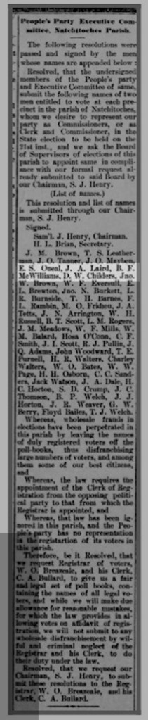 An article in the Natchitoches Populist on 10 April 1896 shows Frank McWilliams as a member of the executive committee of the People’s Party in Natchitoches Parish on that date. An article in the same paper on 28 June 1898 shows a first cousin of Frank’s wife Sarah Jane, William Marshall Hunter, being proposed as head of the nominating committee for candidates of the People’s Party ticket for the state legislature in Red River Parish.
