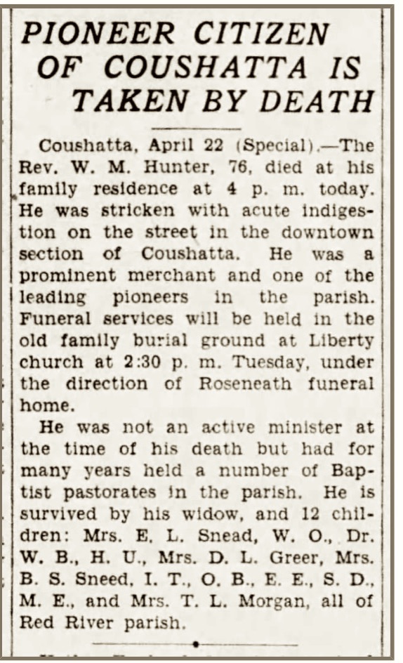 Citizens throughout Red River Parish were deeply grieved Monday when death suddenly claimed Rev. William Marshall Hunter, prominent pioneer citizen of the parish at his home here about 4 P.M., a few hours after being stricken with acute indigestion (heart attack) while on a visit to the business section of the town Monday morning.