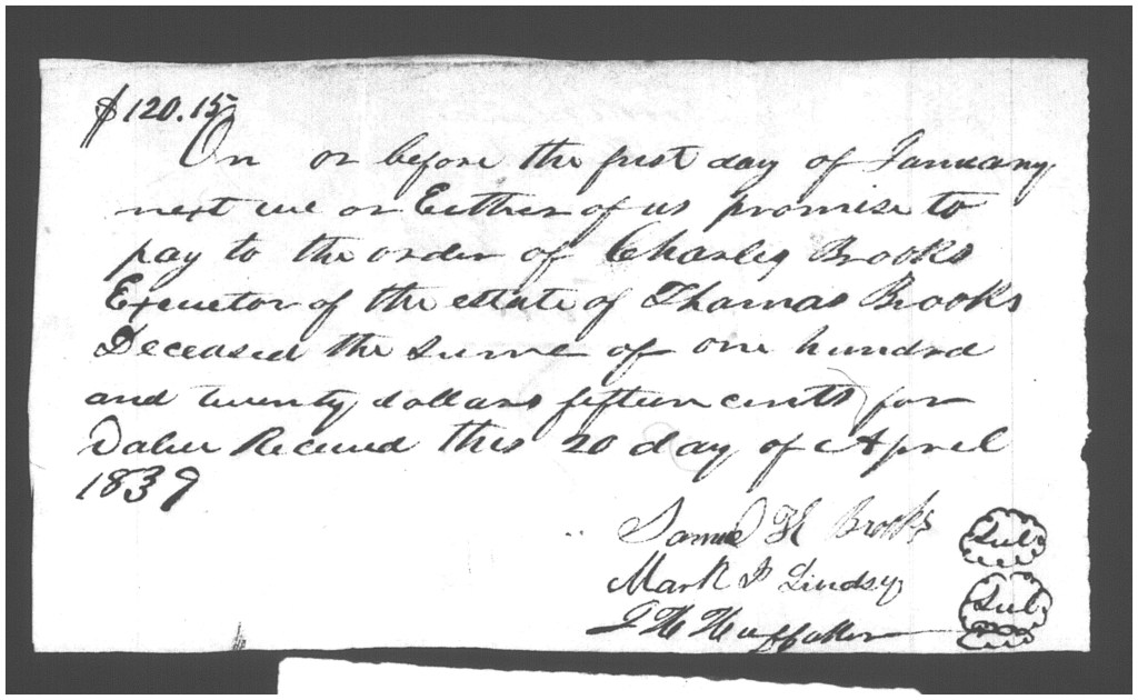 In addition to the 15 September deed of trust in Lawrence County, Alabama, in which Mark J. Lindsey acts as trustee on behalf of Jacob H. Huffaker, I find a promissory note in the loose-papers estate file of Thomas Brooks in Morgan County dated 18 December 1836, signed by Charles Brooks and J.H. Huffaker, showing the two promising to pay Thomas Brooks $300 for value received from him. Charles was Thomas’s son. The estate file also has a promissory note dated the same day signed by Samuel Brooks, another of Thomas’s sons, and J.H. Huffaker. The return of Thomas Brooks’s estate recorded on 18 May 1839 in Morgan County shows two notes owed to the estate by Thomas’s son Samuel Brooks along with J.H. Huffaker.[12]