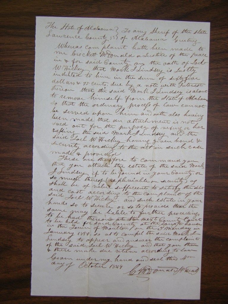 On the same date, Hickey seems to have upped the ante of his legal claim, suing Lindsey with a “Plea of Trespass on the case upon promise to his damage one hundred and fifty dollars.” Joel W. Hickey was a local doctor who appears in the estate records of Mark J. Lindsey’s grandfather Thomas Brooks as the doctor treating Thomas M. Brooks at the time of his death. He witnessed Thomas M. Brooks’s will in Morgan County on 2 October 1838 along with Mark’s brother John Wesley Lindsey. The 1850 federal census shows Joel and wife Susan in Lawrence County, Alabama, with a three-year-old son named Rough & Ready Hickey, a nickname for President Zachary Taylor dating from his service in the Seminole War.