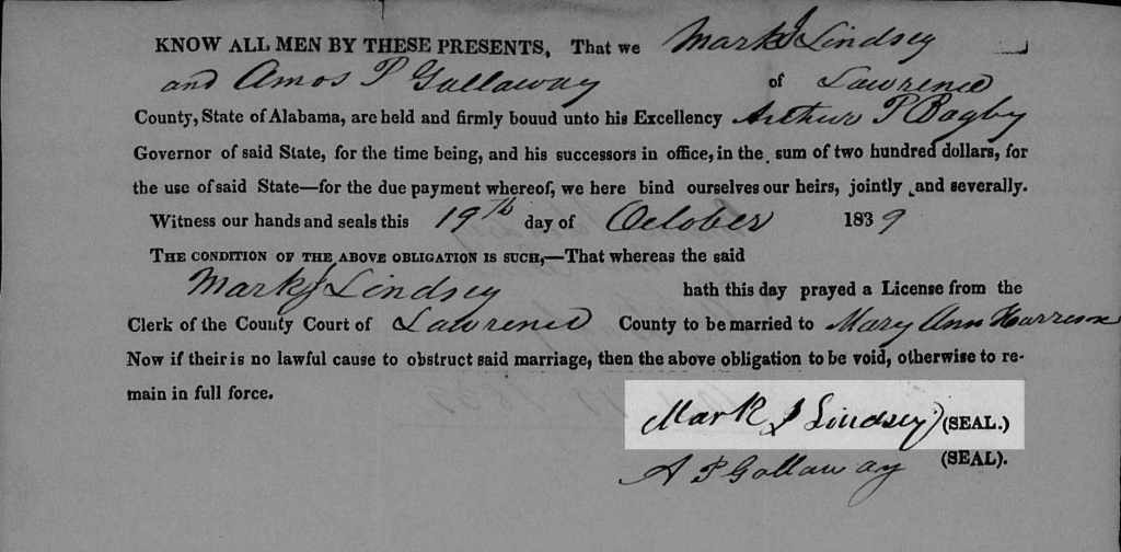 Later in 1839, Mark J. Lindsey married. On 19 October 1839, he gave bond for his marriage to Mary Ann Harrison in Lawrence County with Amos P. Galloway as his bondsman. On 22 October, Methodist minister Moses Stroude Morris married the couple.[13] As noted previously, Moses S. Morris also officiated at the weddings of Mark’s siblings John Wesley Lindsey, Sarah Brooks Lindsey, and Mary Jane Lindsey. For biographical information about Moses, see this previous posting.