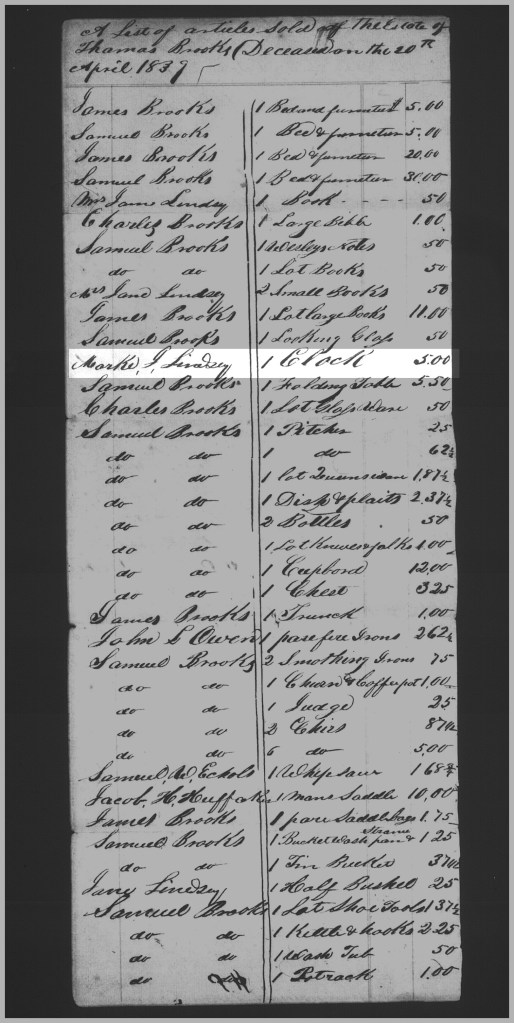 A 10 March 1840 estate account filed by Charles Brooks found in the loose-papers estate file shows that, in addition to cash received at the estate sale, the sale took notes from (among others) Mark Lindsey, J.H. Huffaker, J. Brooks, James R. Brooks, Samuel K. Brooks, Mark J. Lindsey, and Jane Lindsey. On the same date, Milton McClanahan compiled an inventory of notes owing to the estate, also found in the loose-papers estate file. Those owing the estate included, among others, Charles Brooks with several notes signed by both him and J.H. Huffaker, Samuel Brooks and J.H. Huffaker, James. R. Brooks (brother of Charles and Samuel) with several notes signed jointly with J.H. Huffaker, and Mark J. Lindsey with a note signed by J.H. Huffaker. Daniel Shearer also owed the estate a note. The estate file also contains two notes to the estate dated 20 April 1839, one co-signed by Mark J. Lindsey, Jacob H. Huffaker, and James Brooks for $5.00, and another co-signed by Mark J. Lindsey, J.H. Huffaker, and Samuel K. Brooks for $120.15. The account of the sale of the estate, which was held on the same day (i.e., 20 April 1839), shows Mark J. Lindsey buying a clock from the estate for $5.00. Jacob H. Huffaker was also a buyer at the estate sale.