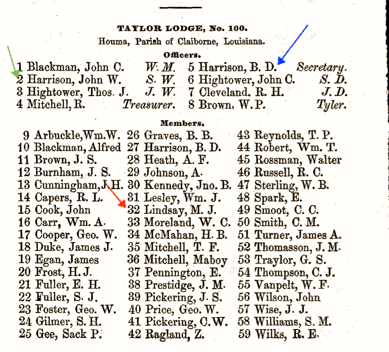 [20] Proceedings of the Most Worshipful Grand Lodge of F. and A. Masons of the State of Louisiana, at its Forty-Fifth Annual Communication, Held at New Orleans, February 8, 1857 (New Orleans: Bulletin, 1857), p. 173; Proceedings of the M.W. Grand Lodge, F. and A. Masons of the State of Louisiana, at its Forty-Sixth Annual Communication, Held at New Orleans, February 8, 1858 (New Orleans: Bulletin, 1858), p. 180, listed as M.J. Lindsay. In 1857, Mark is an affiliated member of the Spearsville lodge.