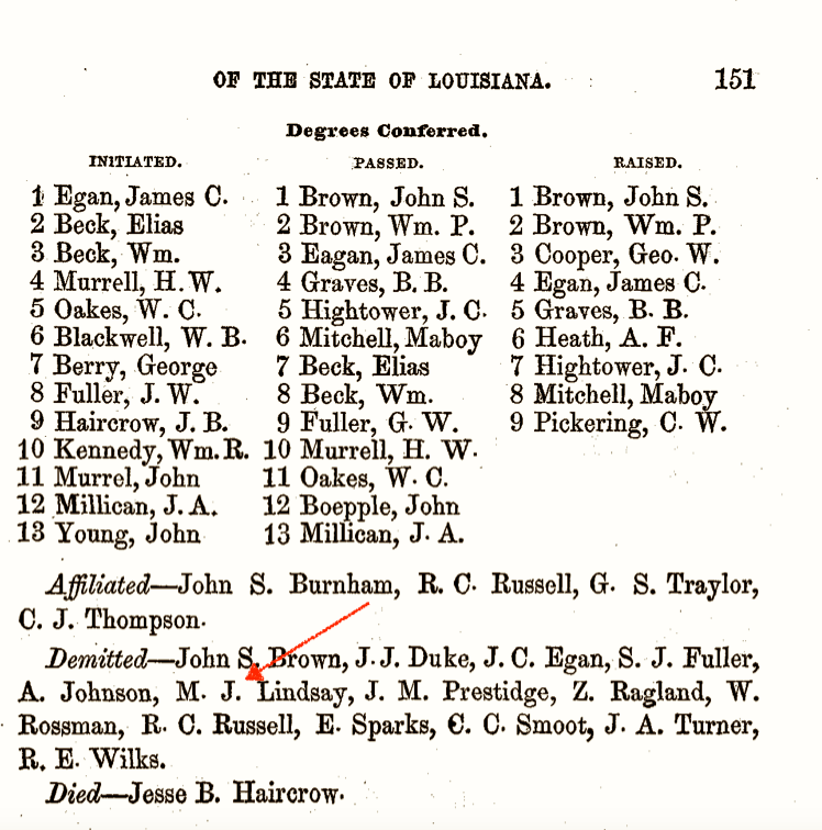 [66] Proceedings of the M.W. Grand Lodge of F. & A. Masons of the State of Louisiana, at Its Fifty-Fifth Annual Communication Held at New Orleans, February 11, 1867 (New Orleans: Bouvain and Lewis, 1867), pp. 246-7.