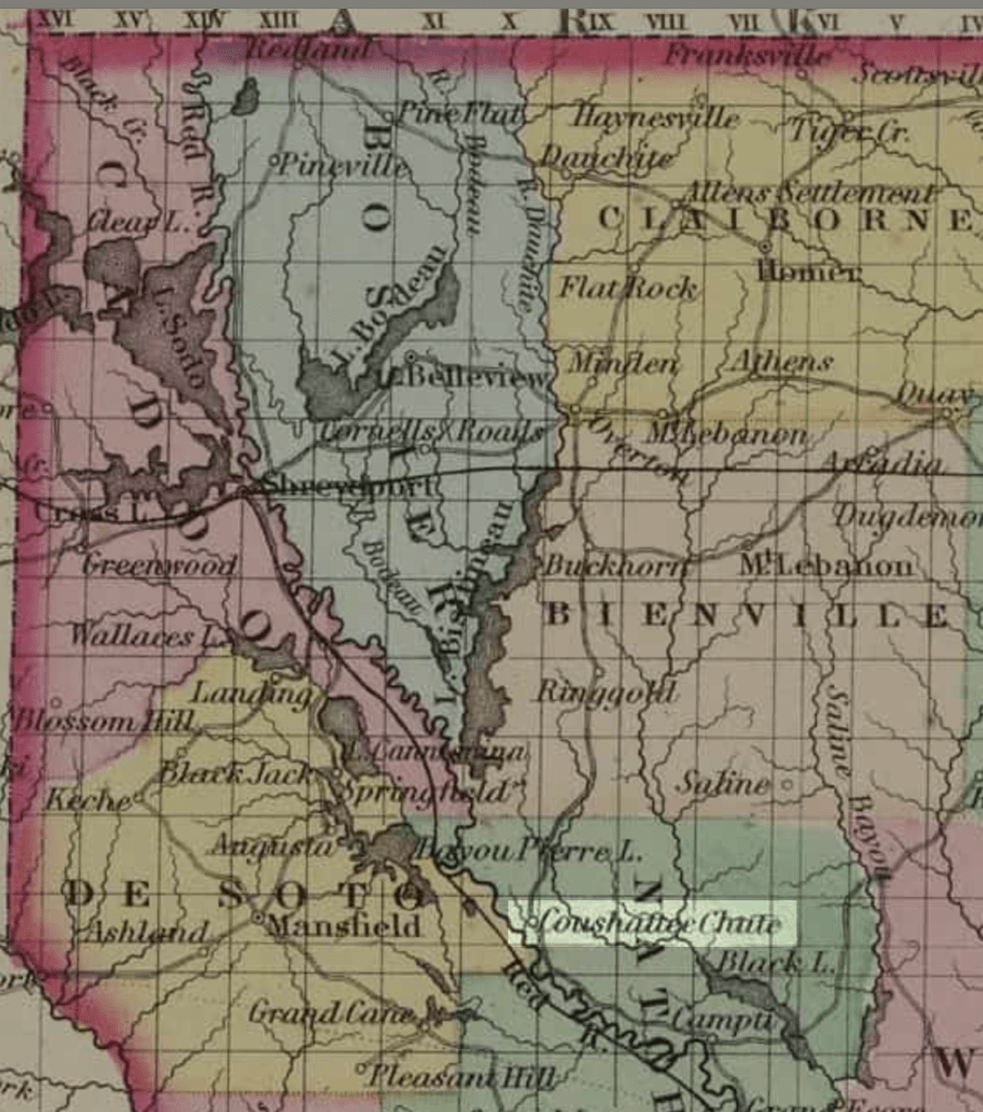 Where Mark and Mary Ann and their family lived in any given year before they moved to Natchitoches Parish in the 1860s is not easy to ascertain. Various documents place them in a number of different locations from 1850, when they are enumerated on the federal census in Bossier Parish, until 1870, when they are at Coushatta Chute in Natchitoches Parish. Bossier had been created from Claiborne in 1843 and in this period, it bordered Claiborne directly on the west. In 1871, Webster Parish was formed and now sits between Bossier and Claiborne Parishes.