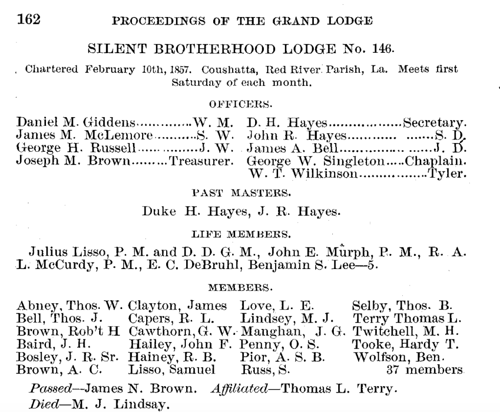[75] Proceedings of the M.W. Grand Lodge of the State of Louisiana, Free and Accepted Masons, Sixty-Second Annual Grand Communication, February 10th, 11th, 12th, 13th, and 14th, 1873 New Orleans: Clark & Hofeline, 1874), p. 220 (now at Coushatta); Proceedings of the M.W. Grand Lodge of the State of Louisiana, Free and Accepted Masons, Sixty-Third Annual Grand Communication, February 8th, 9th, 10th, 11th, and 12th, 1875 (New Orleans: Clark & Hofeline, 1875), p. 186; Proceedings of the M.W. Grand Lodge of the State of Louisiana, Free and Accepted Masons, Sixty-Fourth Annual Grand Communication, February 14, 15, 16, 17, 18 and 19, 1876 (New Orleans: A.W. Hyatt, 1876), p. 210; Proceedings of the M.W. Grand Lodge of the State of Louisiana, Free and Accepted Masons, Sixty-Fifth Annual Grand Communication, February 12th, 14th, 15th, 16th and 17th, 1877 (New Orleans: A.W. Hyatt, 1877), p. 164. See also “More 1876 Masonic Records of Northwest Louisiana,” The Genie (first quarter, 1988), p. 32.