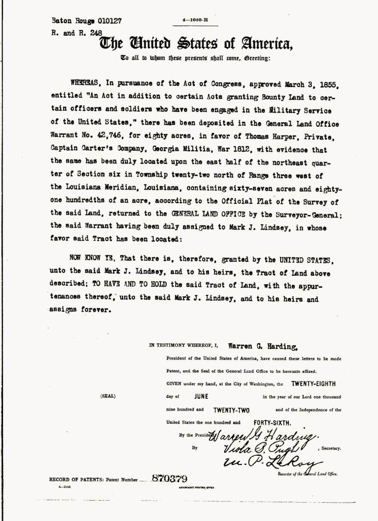 One patent that Mark received in Union Parish under the provisions of the military bounty land act of March 1855 was not officially recorded until 28 June 1922, some four decades after mark died. This was a patent for 67.81 acres, the east ½ northeast ¼ of section 6, township 22 north, range 3 west in Union Parish. The certificate notes that the land had been granted by warrant 42746 to Thomas Harper, a private in Capt. Carter’s company of the Georgia militia, for his service in the War of 1812 following the 1855 act.[24]