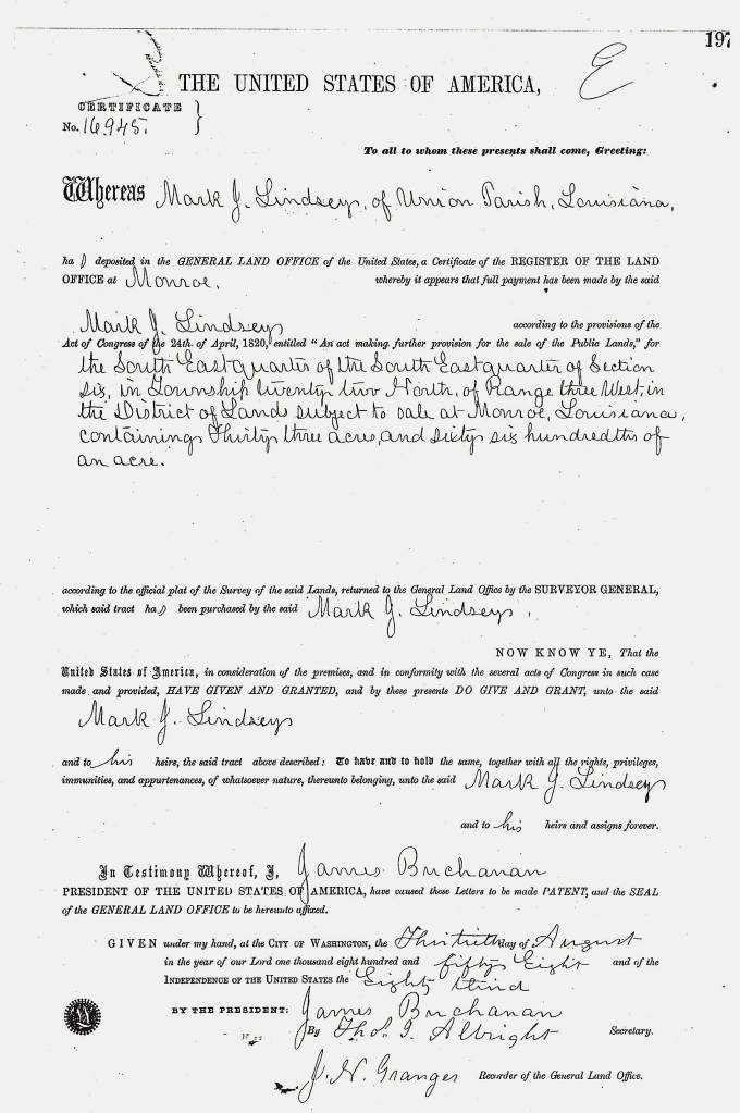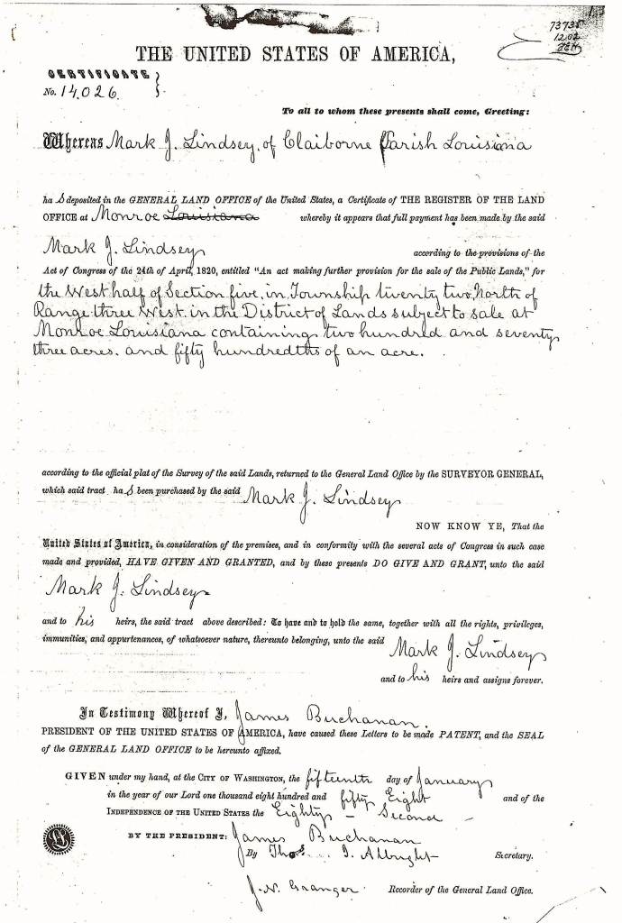 On 13 August 1858, Mark had a certificate from the federal land office in Monroe for another piece of land in Union Parish. The land was 33.66 acres, the southeast ¼ southeast ¼ section 6, township 22 north, range 3 west. The certificate for this tract states that Mark J. Lindsey was of Union Parish, Louisiana.[17]
