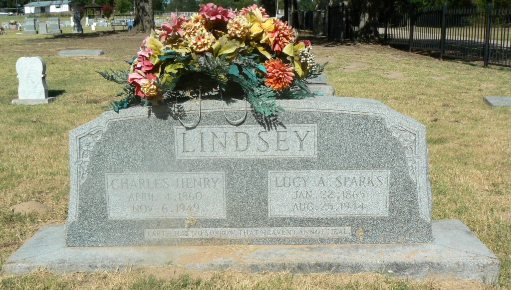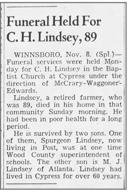 [22] Henry C. Lindsey, Mark Lindsey Heritage, p. 100, has dates of birth and death for Charles Henry Lindsey and wife Lucy A. Sparks Lindsey, supplied to Henry C. Lindsey by Charles’s children. Charles’s death certificate also has his dates of birth and death. For his place of birth, it simply states, “Louisiana,” and for his parents’ names, it states, “unknown.” Information was supplied by Charles’s son Mark Jefferson Lindsey (Texas death certificates, Franklin County, October-December 1949, #53257). The dates of birth and death are also on Charles’s tombstone in Cypress cemetery at Cypress, Franklin County, Texas.