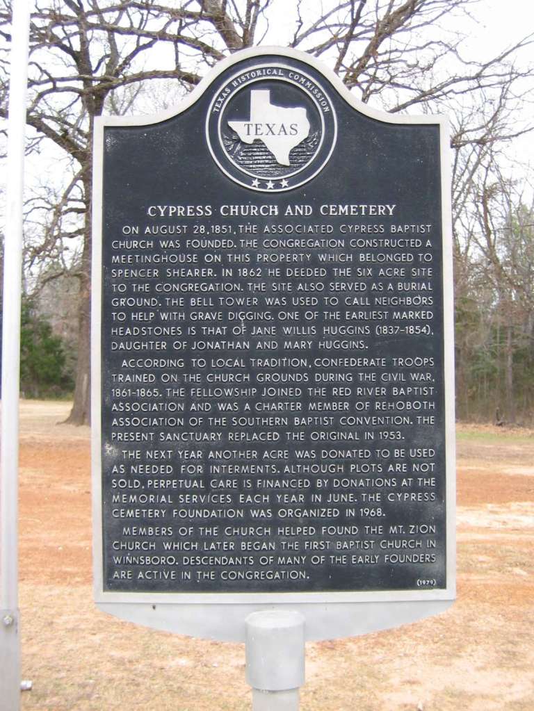 [29] See also Cecil Harper, Jr., “Cypress, TX (Franklin County),” Handbook of Texas, online at website of Texas State Historical Association; and Jim Birdsong, “Cypress Cemetery, Cypress, Franklin County, Texas,” at the Interment.Net website.