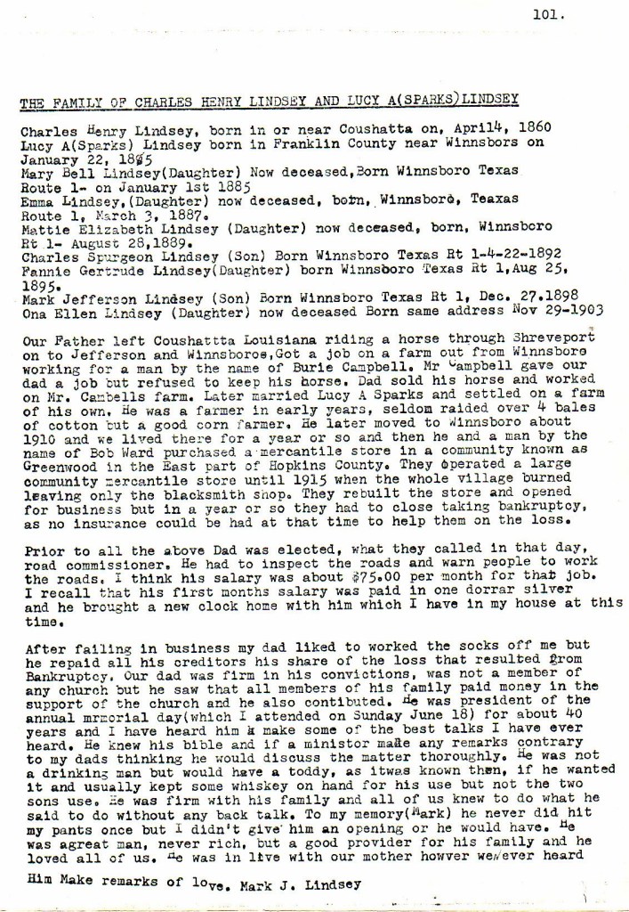 In his previously cited memoir of his father, Charles’s son Mark Jefferson Lindsey states that after marrying Lucy A. Sparks, Charles settled on his own farm and then moved his family about 1910 to Winnsboro. About a year after this, he bought a store that he co-owned with Bob Ward at Greenwood in Hopkins County, moving his family there. In 1915, Greenwood burned, destroying the store, and though his father and Ward rebuilt the store and re-opened it, they had to declare bankruptcy after a year or so, since they could not find insurance to cover their losses in the fire. Mark J. Lindsey also states that his father was a road commissioner prior to this — it’s not clear to me if this was in Franklin or Hopkins County — and had a salary from that position.