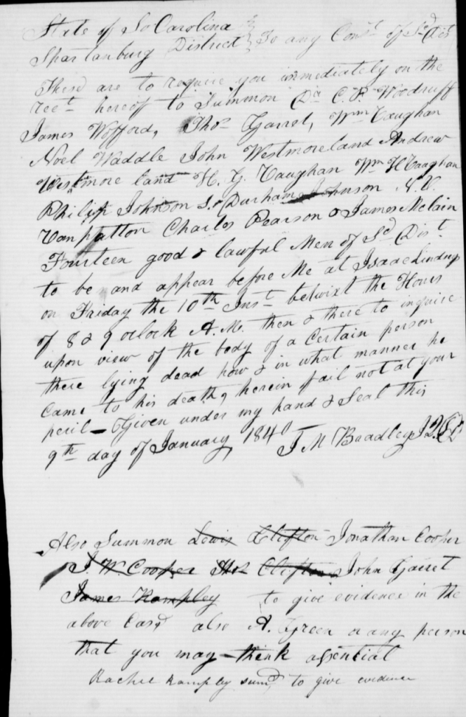 [17] Spartanburg County Quorum Court, “The State vs. the Dead Body of William Lindsey,” Coroner’s Inquisition, online at the CSI: Dixie site of the Center for Virtual History at University of Georgia.