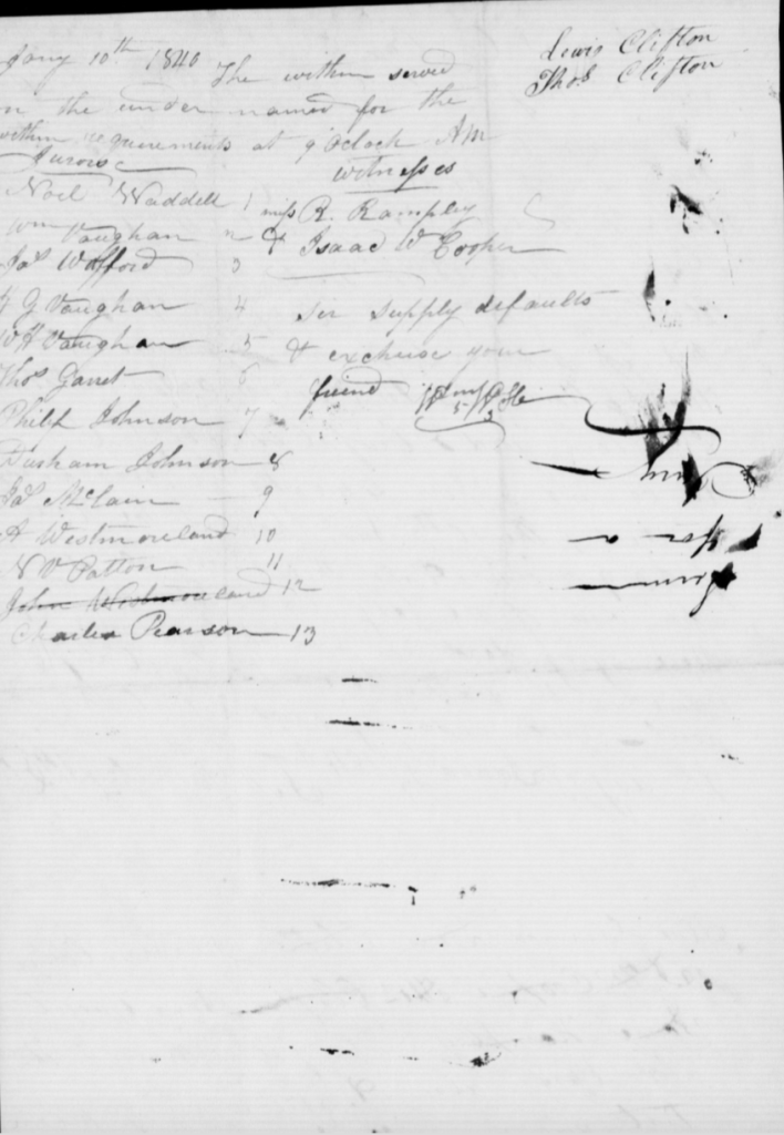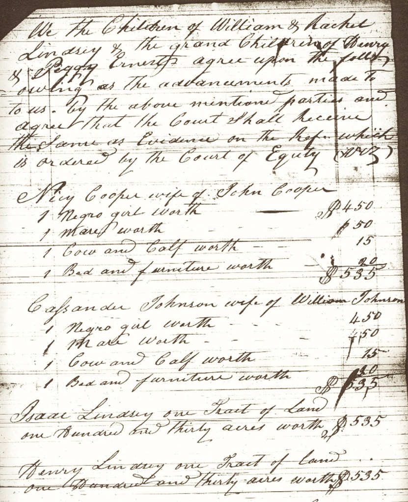 The case file for this lawsuit contains a document advancing shares of Henry Earnest’s property to the some, but not all, of the children of William and Rachel. This document is dated 26 February 1840. It shows the following heirs receiving advancements on their shares: Nicy Cooper, wife of John Cooper; Cassander [sic] Johnson, wife of William Johnson; Isaac Lindsey; Henry Lindsey; Elizabeth Cooper; Rachel Halbert; and John Lindsey. The document is signed by William Johnson, Isaac Lindsey, Henry Lindsey, Elizabeth Cooper (her mark), William Halbert, John Cooper, and John Lindsey, with John Allen and J.M. Bradley witnessing it.