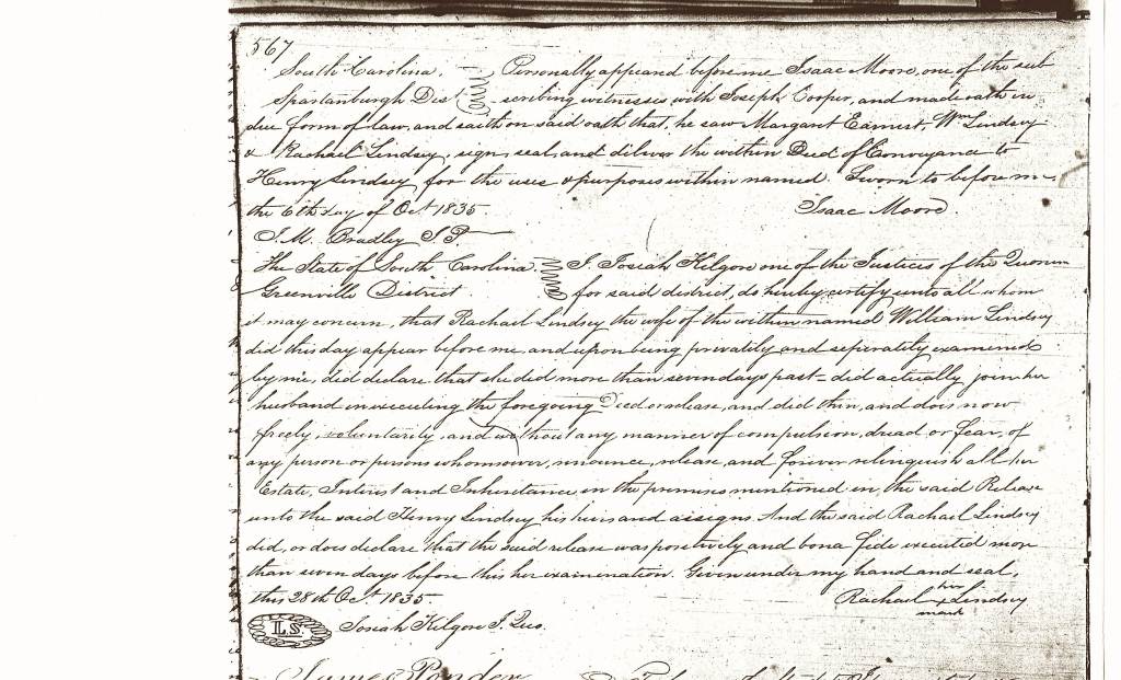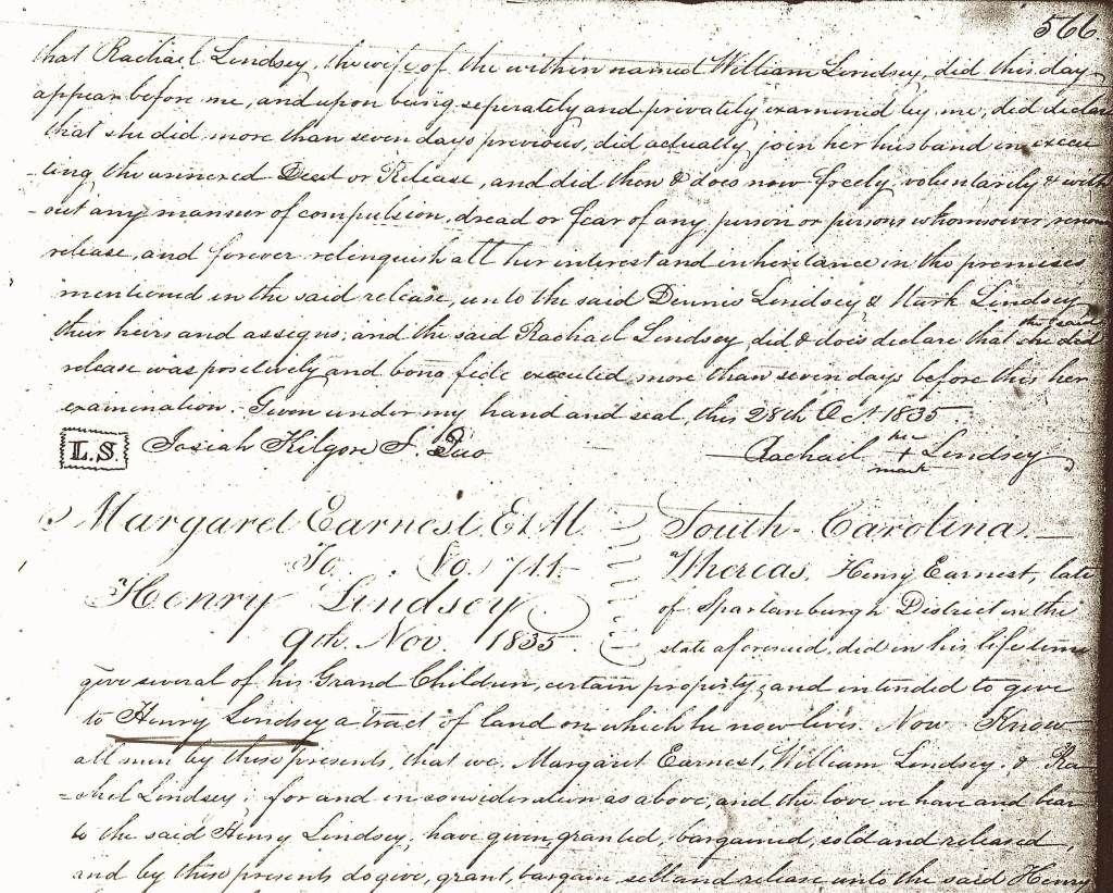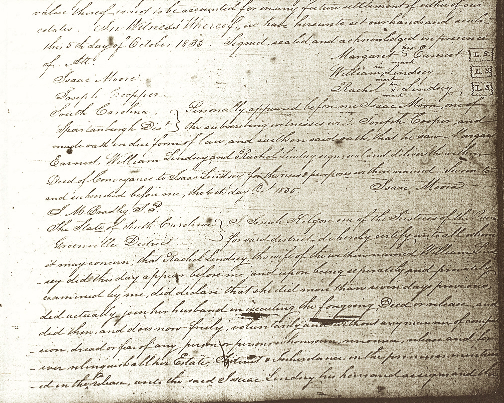 As Henry Earnest’s estate was being settled, on 5 October 1835 his widow Margaret, along with William Lindsey and Rachel Earnest, who were the sole heirs of Henry’s estate, according to a documents found in a lawsuit Rachel filed against her mother and husband in 1835,[5] began deeding some of Henry’s land to his grandchildren. The first 5 October 1835 deed the three made was to son Isaac, a deed of 130 acres on which he was then living on the Enoree, bordered by a spring, Snorley Creek, and a spring branch.[6] The deed states that Henry had intended for Isaac to have this land and his widow and daughter and son-in-law were deeding it to Isaac for love and affection. Isaac Moore and Joseph Cooper witnessed the deed, and William, Rachel, and Margaret all signed it by mark. Both witnesses proved the deed the following day, with Rachel renouncing her dower rights on 28 October, and the deed was recorded 9 November. On the connection of the Moore and Cooper families to this Lindsey family, see the preceding posting.