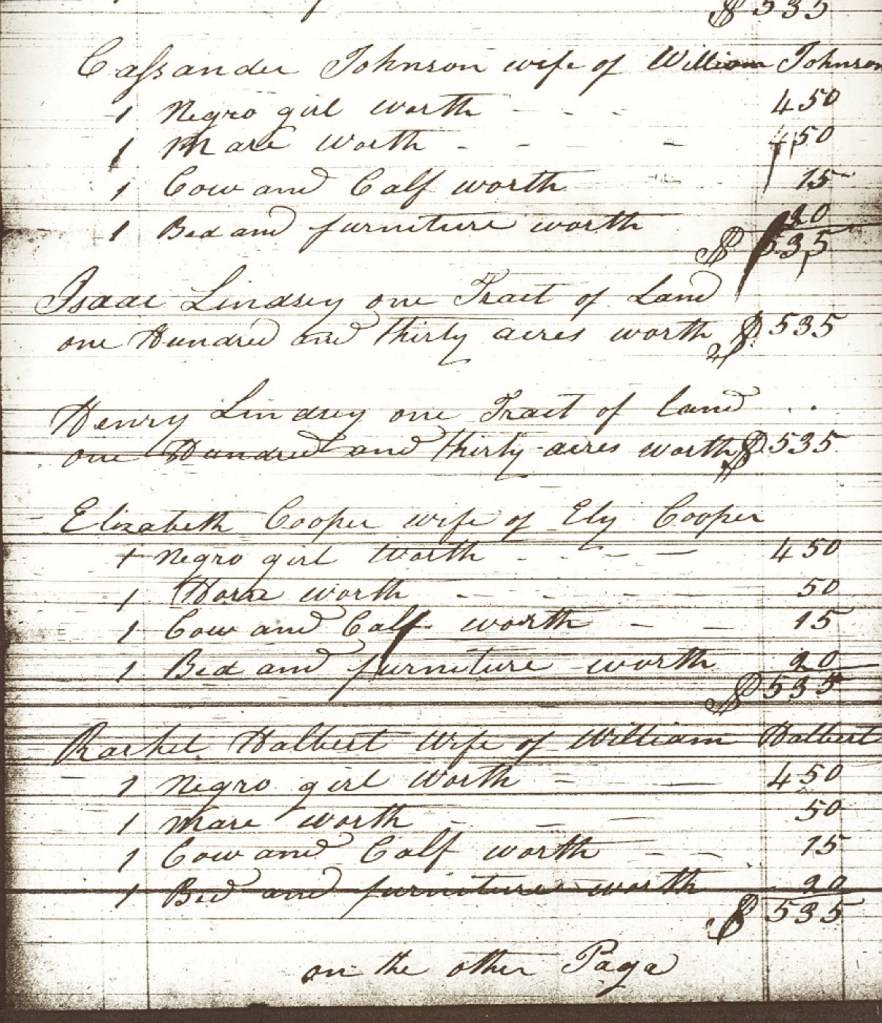 Henry’s widow Margaret bought enslaved persons Sam, Dick, and Jude. Of Henry and Rachel’s sons, John bought an enslaved man Myer, Dennis bought an enslaved woman Chaney, Henry bought enslaved persons Mary and George, and Isaac bought enslaved person Abbey. William Halbert, second husband of William and Rachel’s daughter Rachel, bought an enslaved woman Polly.