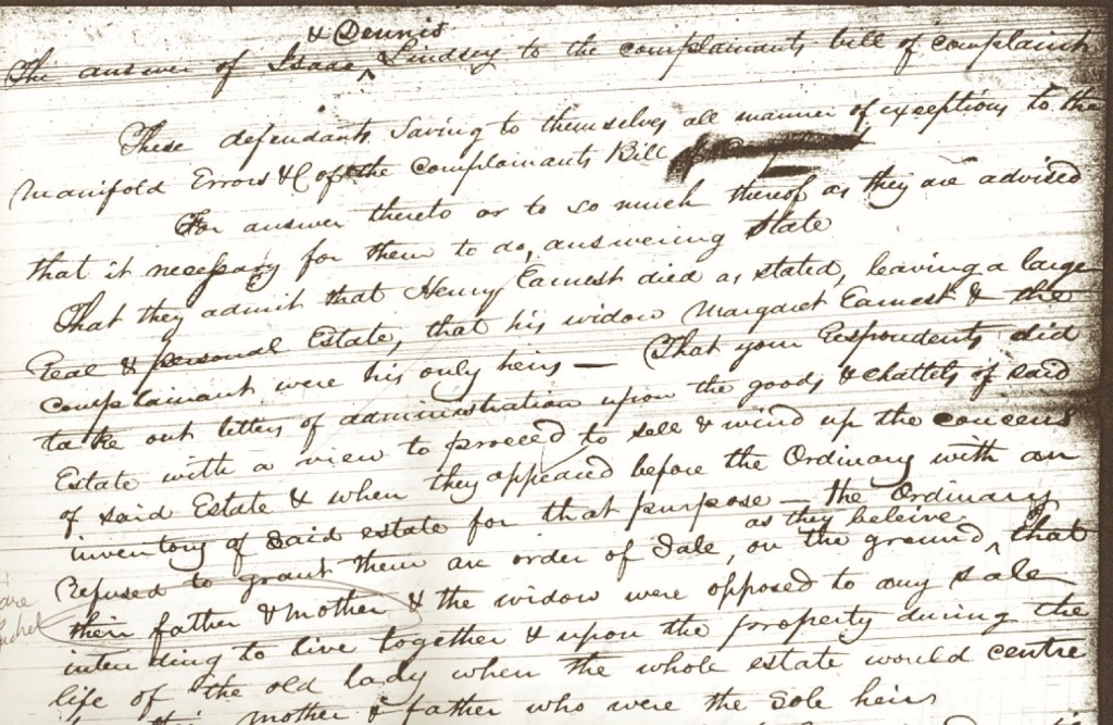 The case file has the response of Isaac and Dennis Lindsey to the complaint bill, undated, but apparently from 1835. This notes that when Isaac and Dennis had presented an inventory of Henry Earnest’s estate to the court, the court refused to grant them an order of sale, apparently because their parents were opposed to the sale, “intending to live together & upon the property during the life of the old lady [i.e., Margaret Earnest] when the whole estate would centre upon their mother & father who were the sole heirs.” Isaac and Dennis also denied that their father was either habitually intemperate or insolvent.