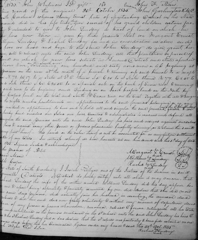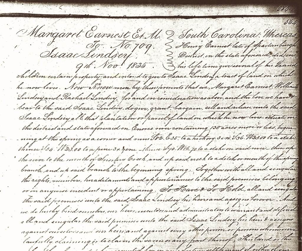 I do not spot William and Rachel Lindsey’s son John on the 1830 federal census. The one John Lindsey I find in Spartanburg County on this census is the John who was son of Elisha Lindsey, and who married Susan Lee.[3] As my last posting, linked at the head of this posting, states, that John has gotten confused with the son of William and Rachel of the same name, but DNA findings show his family entirely unrelated to the family of William Lindsey. As we’ll see in a moment, a deed of gift that William and Rachel made along with Margaret Earnest on 20 October 1835 to William and Rachel’s son John states that he was living in Laurens County, South Carolina, when that deed was made. So it’s possible he was in Laurens County by 1830. If so, I haven’t found him on the census there in that year.