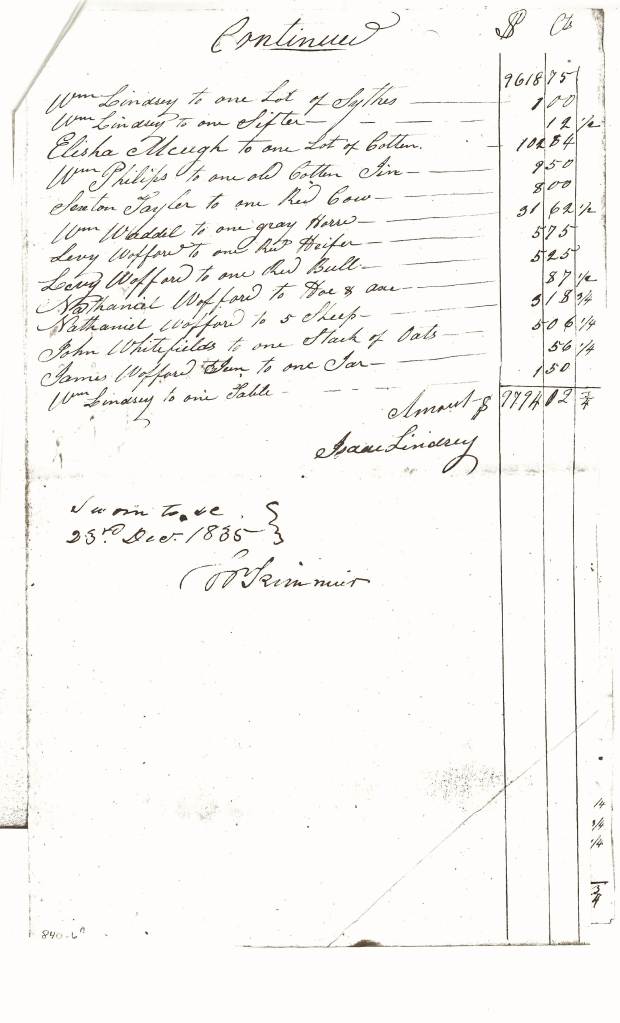 Another bill of complaint in the file, apparently also dated 1835, since it speaks of the impending sale of Henry Earnest’s estate that took place in November 1835, states that the estate of Henry Earnest had been administered by Isaac and Dennis Lindsey, who took the estate in trust, and were shortly to sell all the personal estate that Rachel’s husband William had not wasted. Rachel was willing for the sale to take place, provided her interest could be paid over to a trustee. The petition then goes on to repeat the claims about William Lindsey’s drunkenness, insolvency, and cruelty to his wife.