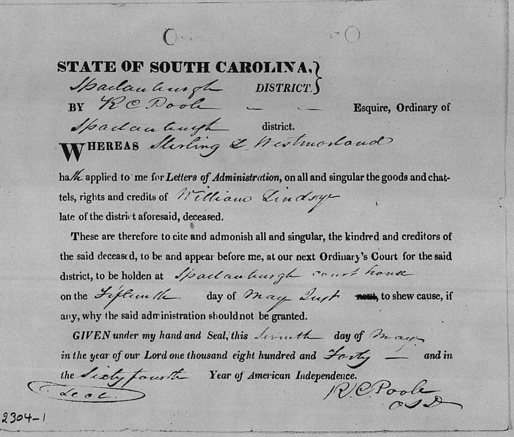 [18] Spartanburg County, South Carolina, loose-papers estate files, William Lindsey estate, #2304.