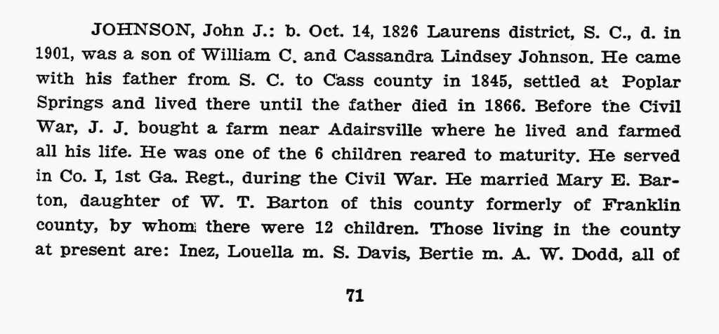 Biographies of William C. Johnson and Cassandra Lindsey Johnson’s son John J. (Jefferson) Johnson in Memoirs of Georgia and History of Bartow County, Georgia both state that his parents were William C. Johnson and Cassandra Lindsey, who moved from South Carolina (Laurens County is implied) in 1845, settling at Poplar Springs near Adairsville in what was then Cass County but later became Bartow County.[3] John Jefferson Johnson (1826-1901) farmed with his father at Poplar Springs up to William C. Johnson’s death in 1866 and then bought a farm at Adairsville, where he spent his remaining years.