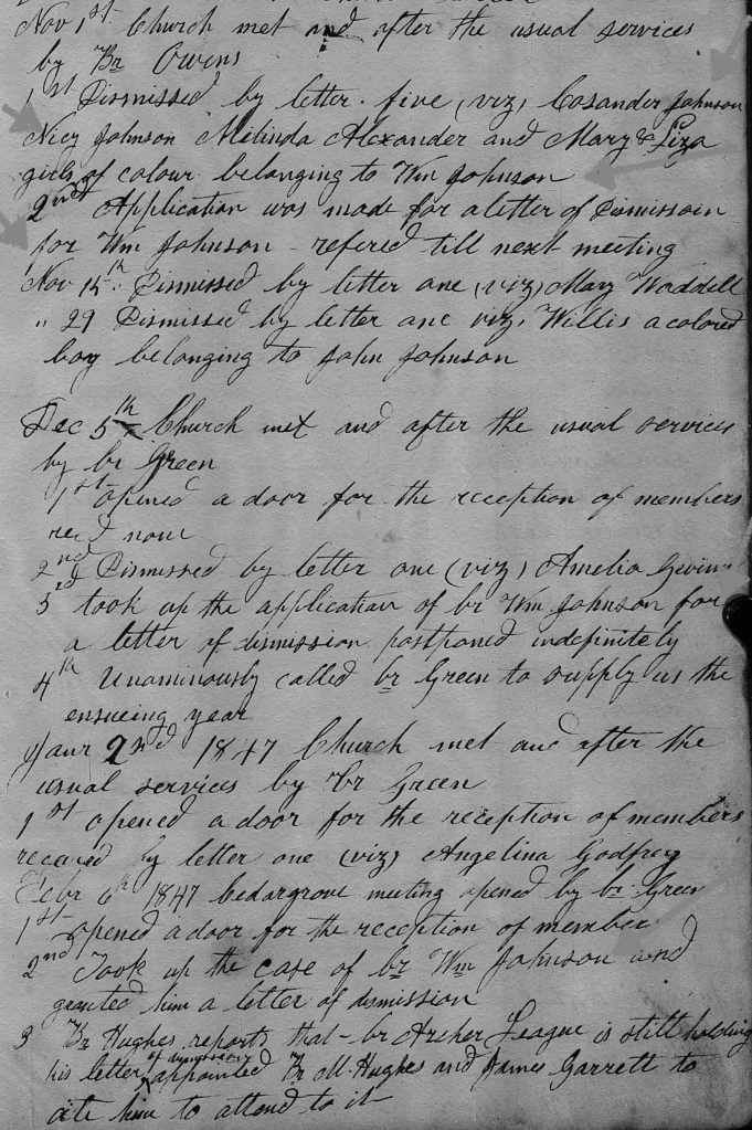 Cedar Grove church minutes show Mary, a “girl of colour” belonging to William Johnson, being accepted into the church’s membership by experience on 31 July 1841. Another enslaved woman belonging to William Johnson, Eliza, was accepted by experience into church membership on 5 September 1840 and later given a letter of dismissal. Church minutes show William Johnson playing an active role in Cedar Grove in the 1830s: on 1 August 1835, the church appointed him with M. Scruggs appointed to deal with the case of J. Fowler, about whom there had been “evil reports” due to his absence from church. On 2 February 1839, the church appointed William Johnson and R.H. Vaughan to cite Erasmus Vaughan for not attending church.