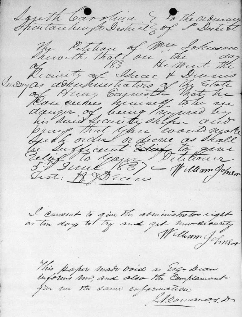 - 1 August 1846: the bill of complaint filed by Cassandra’s mother Rachel Earnest Lindsey in her lawsuit against her son-in-law William Anson Halbert states that William Johnson was planning to move from South Carolina at that date. Rachel alleged that after William Johnson gave bond with William Halbert to handle her inheritance from her father Henry Earnest, they both appropriated some of the property to themselves. Halbert then left the state, and Rachel says that Johnson was making plans to do the same, and she appealed to the court to restrain him from leaving and to subpoena him to give an account for his handling of her estate from her father.