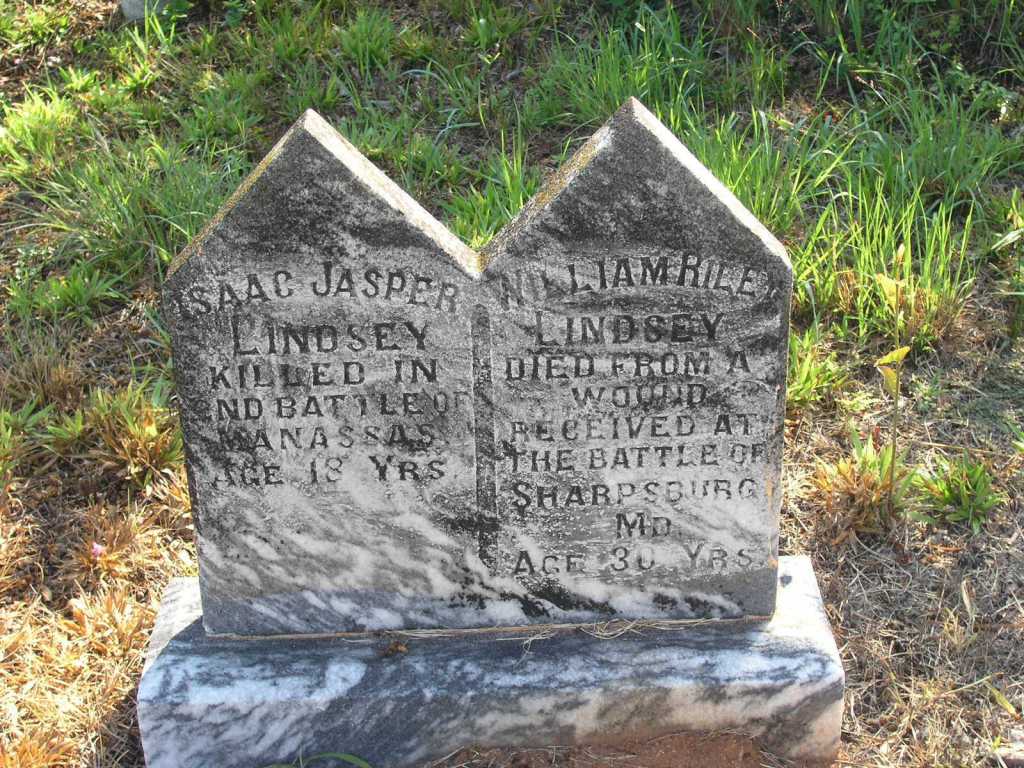 1. William Riley Lindsey was born about 1829 in Spartanburg County, and died on 26 September 1862 of wounds he received in the battle of Antietam at Sharpsburg in Washington County, Maryland. William was a private in Company K of the 3rd regiment of the South Carolina infantry, CSA. His CSA service papers state that he died at the farm of Elias Groves, evidently near Sharpsburg. A monument to him and his brother Isaac in Cedar Grove Baptist cemetery, Fountain Inn, Laurens County, where their parents are buried, gives his age as 30 at the time of his death and states that he died of wounds at the battle of Sharpsburg. This would place his birth around 1832, but as noted above, he is in his parents’ household on the 1850 federal census, aged 21. It appears William did not marry.